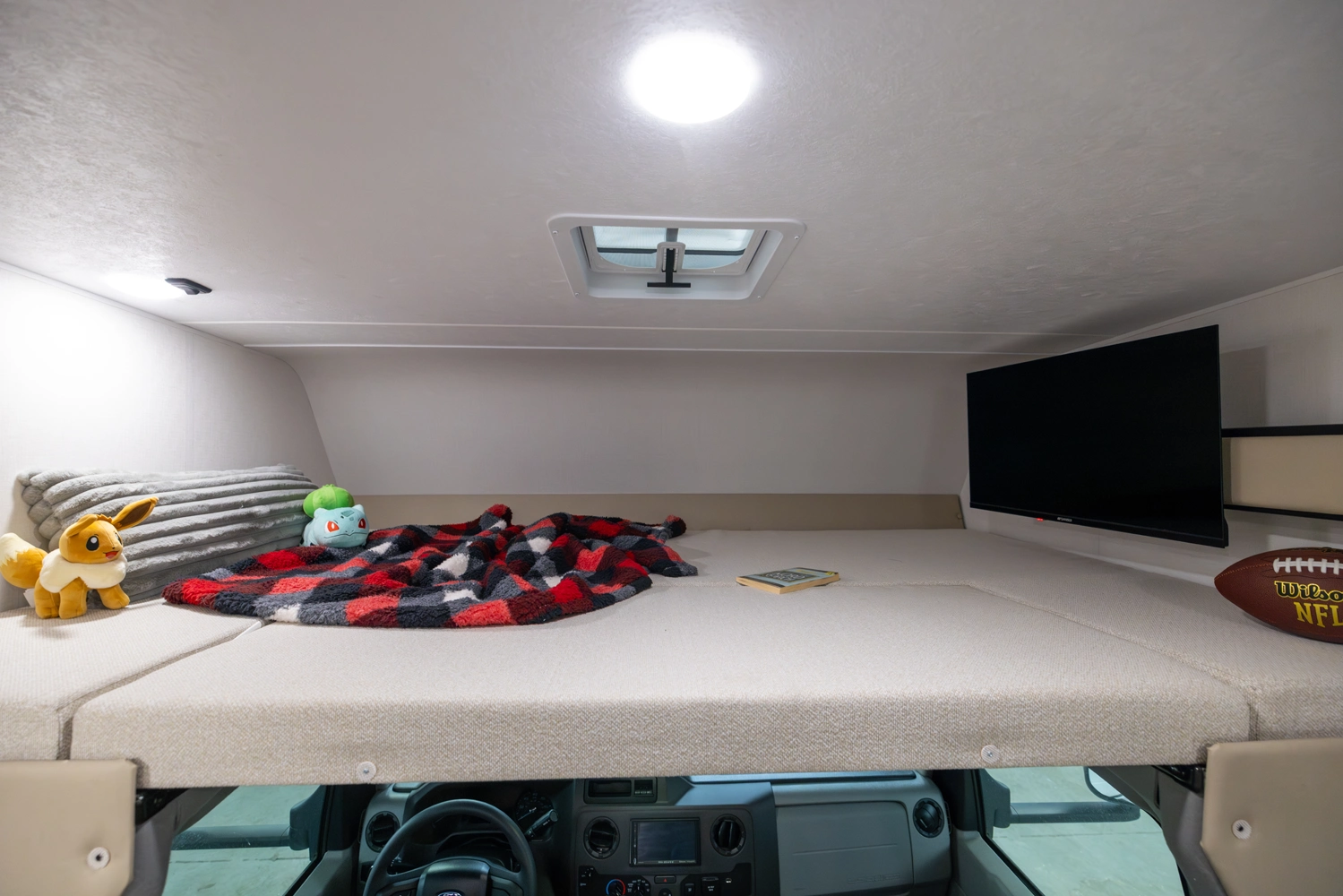 • Large Cab Over Bunk - 57" X 95" with Storage, Cup Holders and USB ports