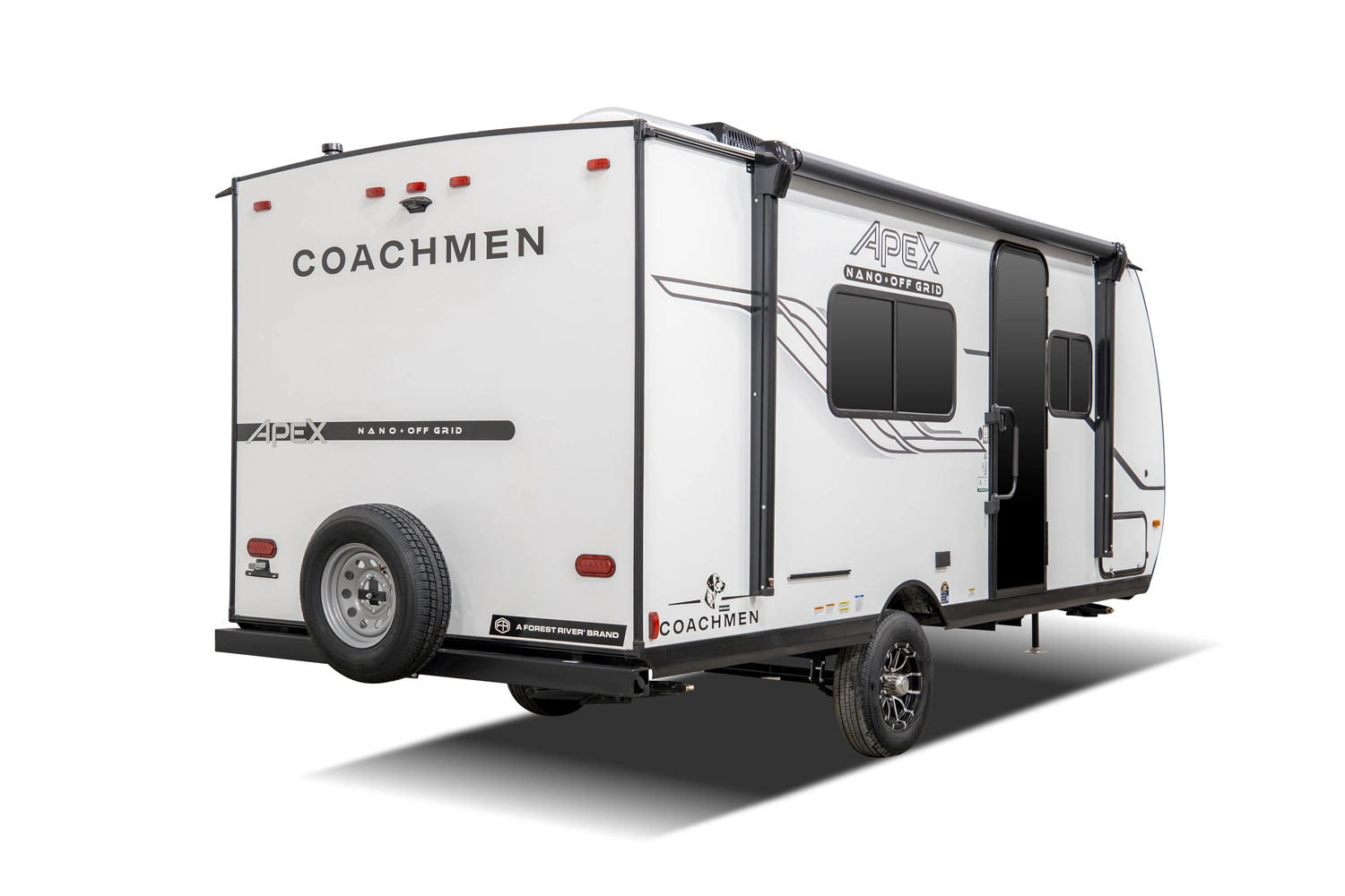 Designed for couples, the Apex Nano 187RB offers a walk-around queen bed, lots of storage, and a lightweight yet durable construction. At 22' 5", it is a nimble coach for chasing sunrise summits or settling in under the stars.