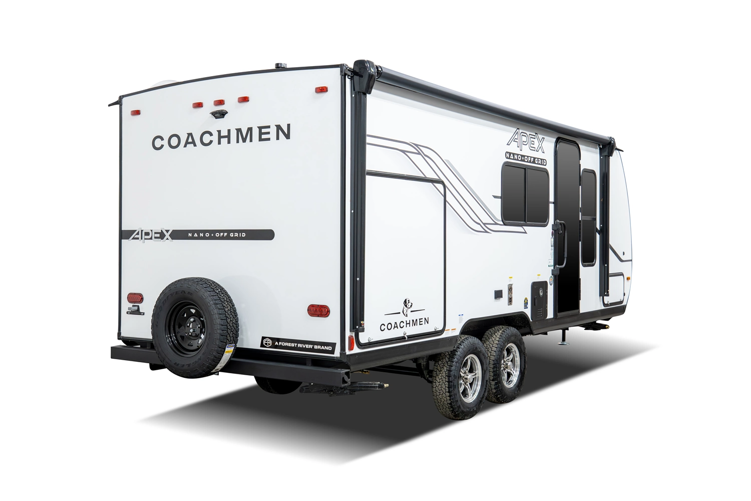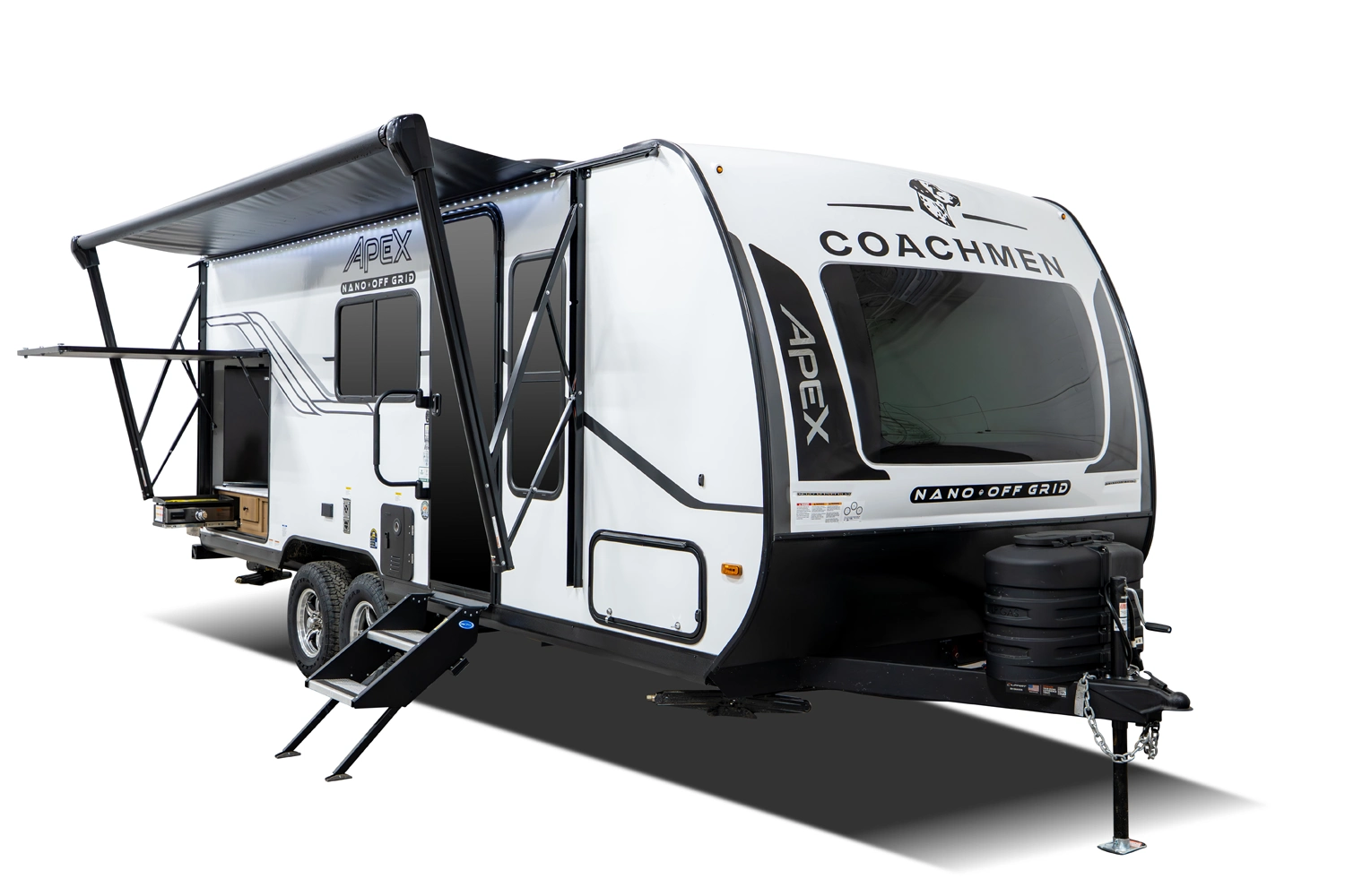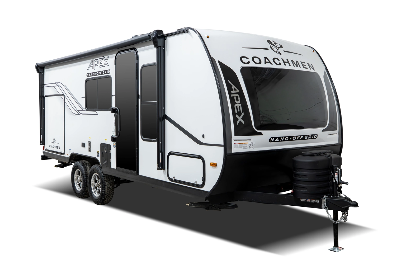 The Apex Nano 203RBK combines a large rear bath and full outdoor kitchen with lightweight construction. At just over 23 feet, it offers efficient storage, a spacious dinette, and a walk-around bed, making it ideal for couples chasing the perfect campsite.