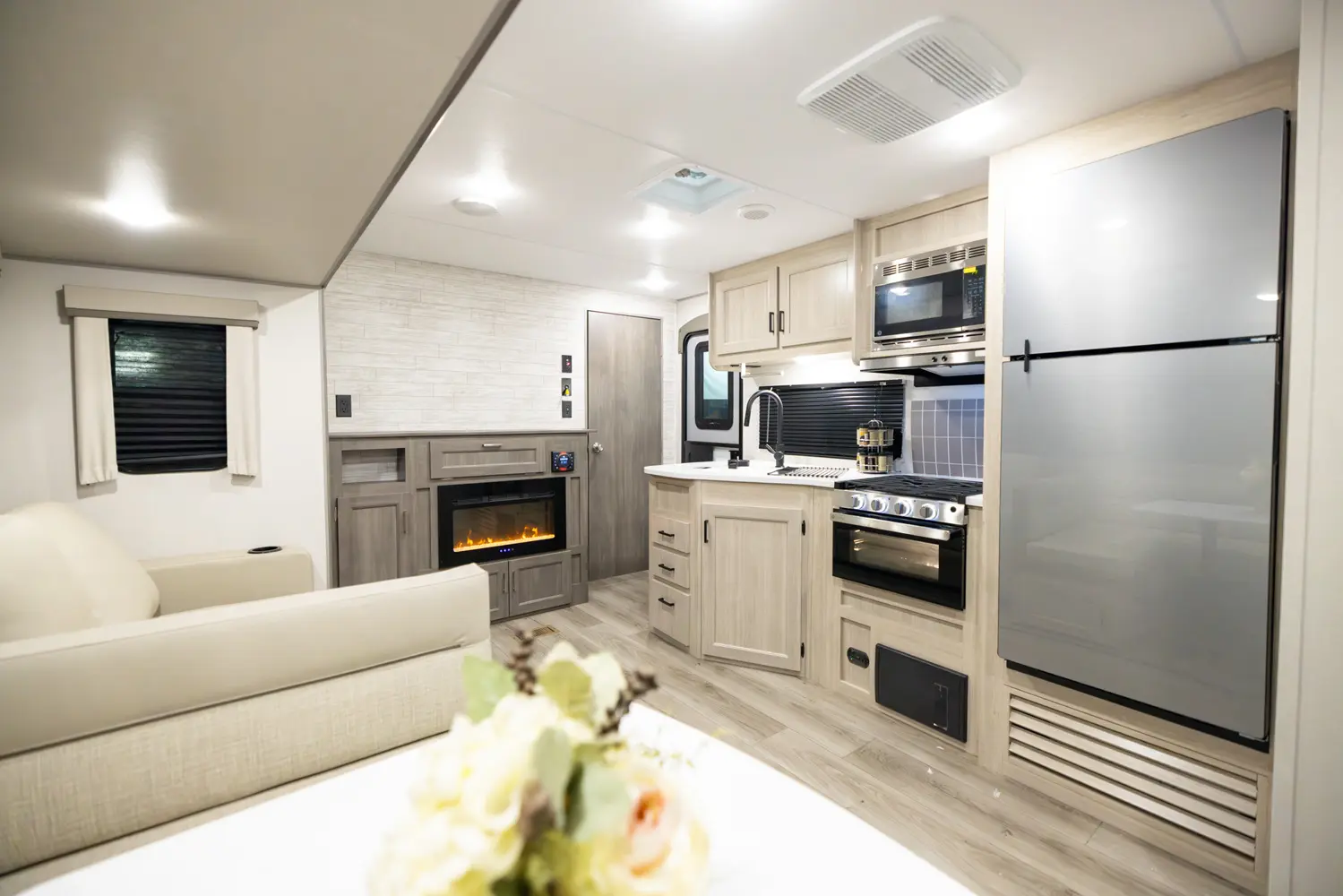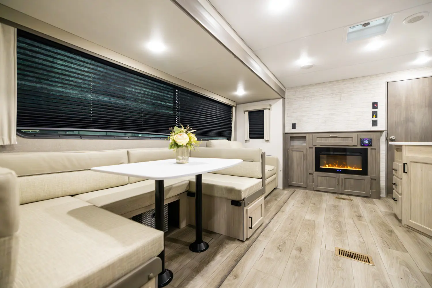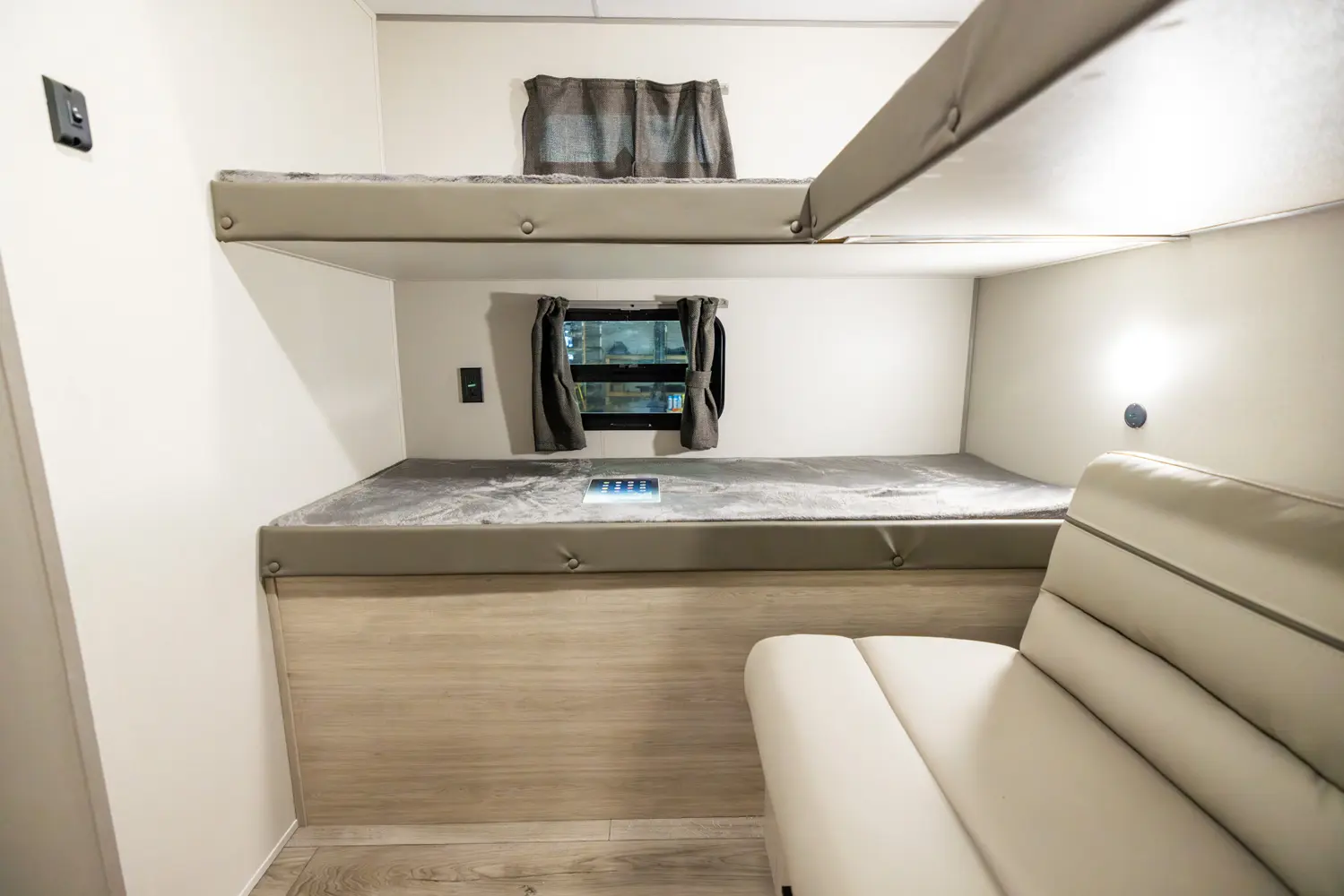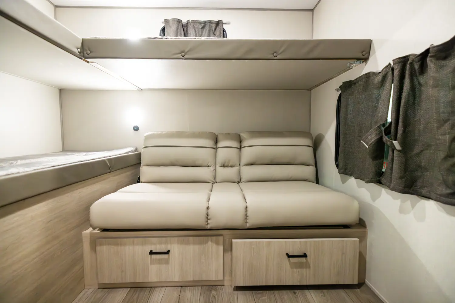 The 293QBCK is our unique take on the traditional quad bunk floorplan. The extra-large U-shape dinette offers plenty of seating while the bunk room easily sleeps 5+ and is designed for the maximum amount of comfort and convenience. The bunk room comes with its own wardrobe, dresser, and a solid slider door for privacy. No bunk house is complete without the addition of our standard outside camp kitchen with mini refrigerator, pull-out griddle cooktop, storage cabinet and sprayer hose!