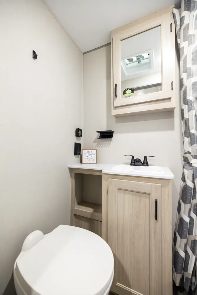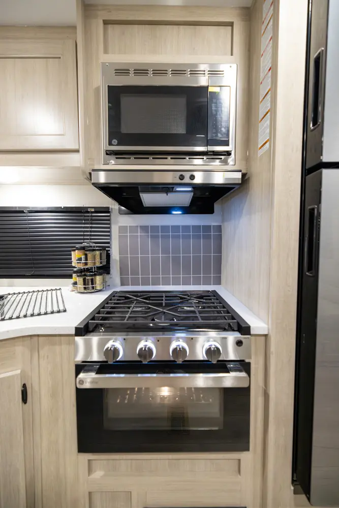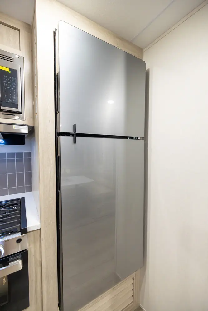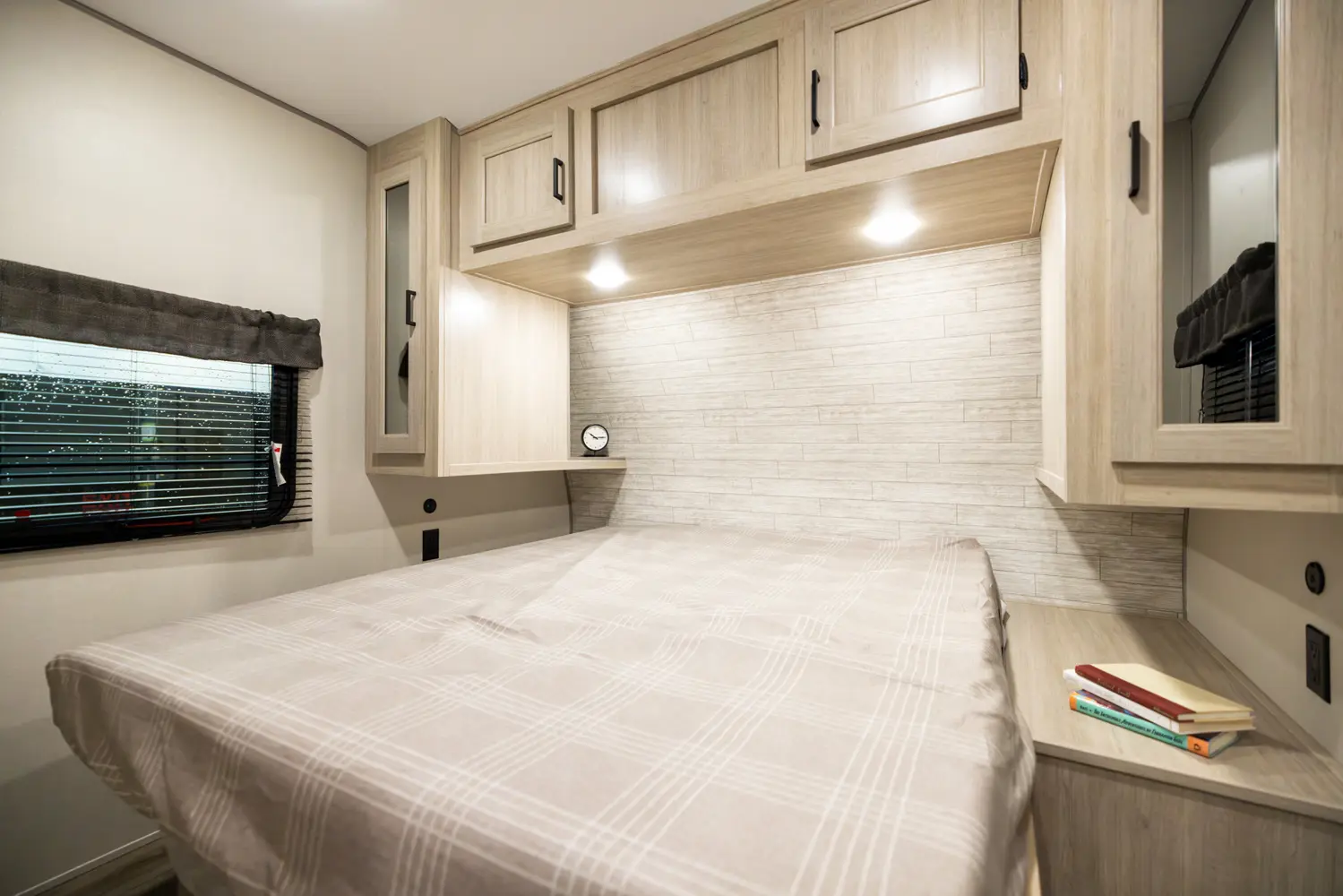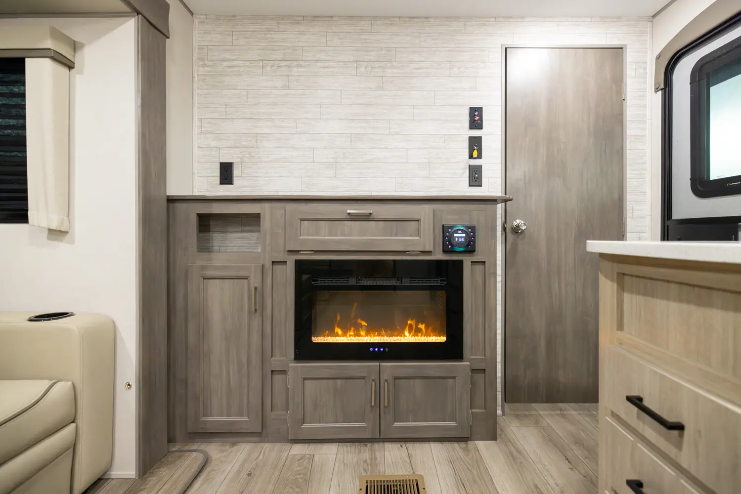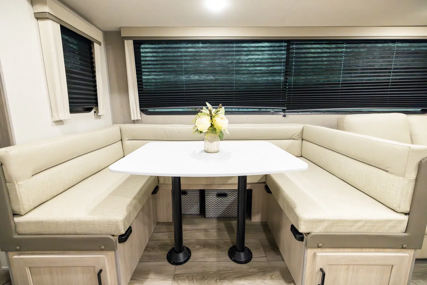The 293QBCK is our unique take on the traditional quad bunk floorplan. The extra-large U-shape dinette offers plenty of seating while the bunk room easily sleeps 5+ and is designed for the maximum amount of comfort and convenience. The bunk room comes with its own wardrobe, dresser, and a solid slider door for privacy. No bunk house is complete without the addition of our standard outside camp kitchen with mini refrigerator, pull-out griddle cooktop, storage cabinet and sprayer hose!