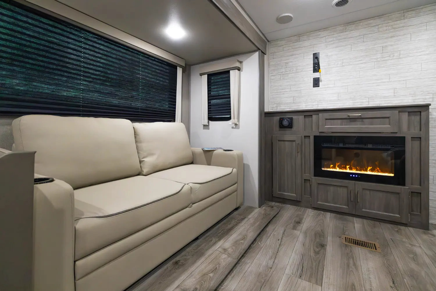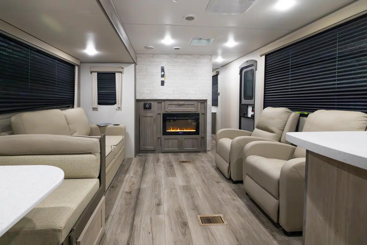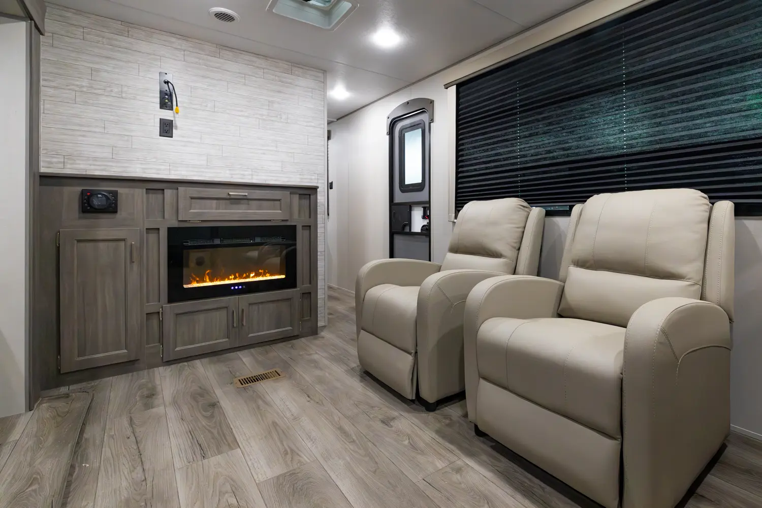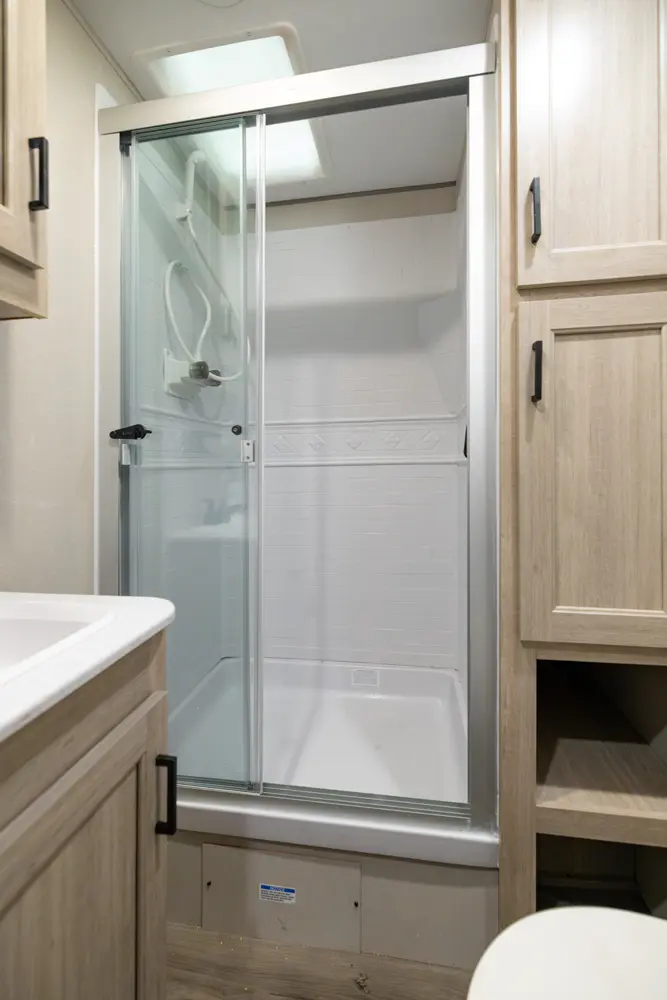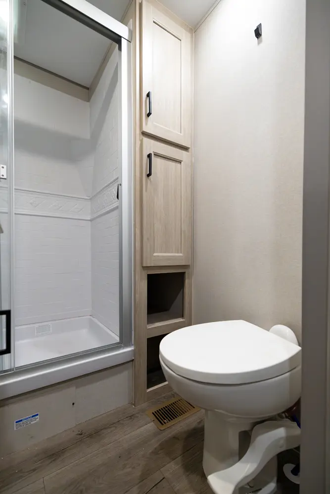 The 303RKDS is your home away from home! The rear kitchen steals the show with expansive counter space and abundant overhead storage. The location of the kitchen allows for a very spacious living room that includes two recliners directly across from the slide-out sofa. The bedroom includes its own entertainment center and fireplace, an enormous closet with full length hang rod and shelves, as well as an additional utility closet complete with everything you need to add a washer/dryer.
