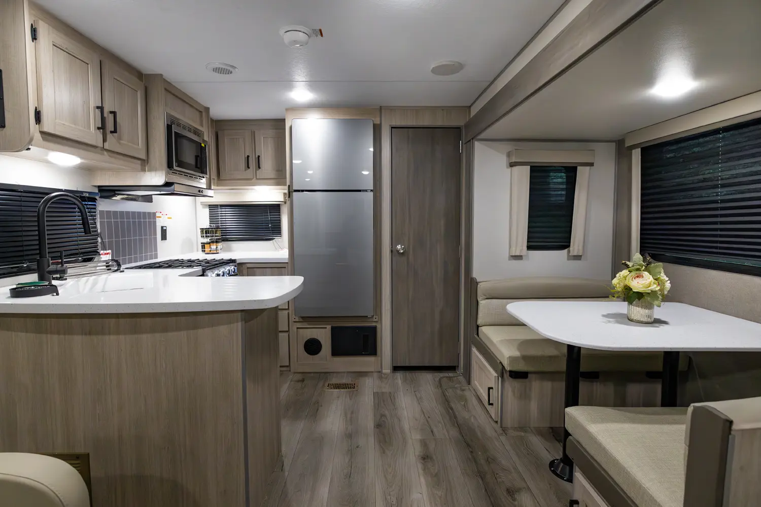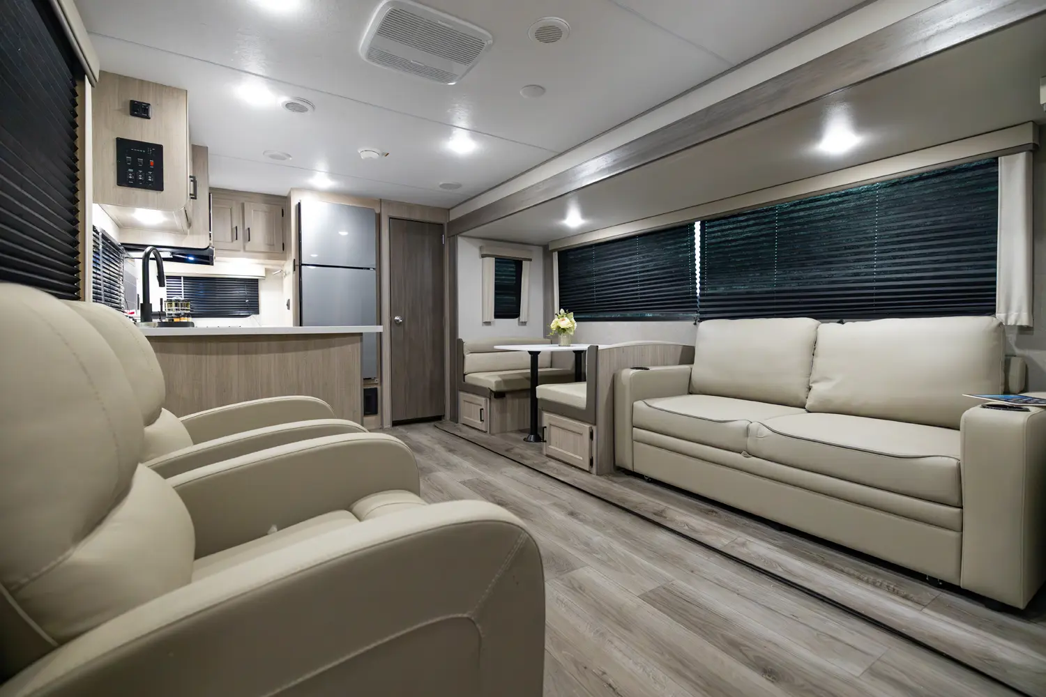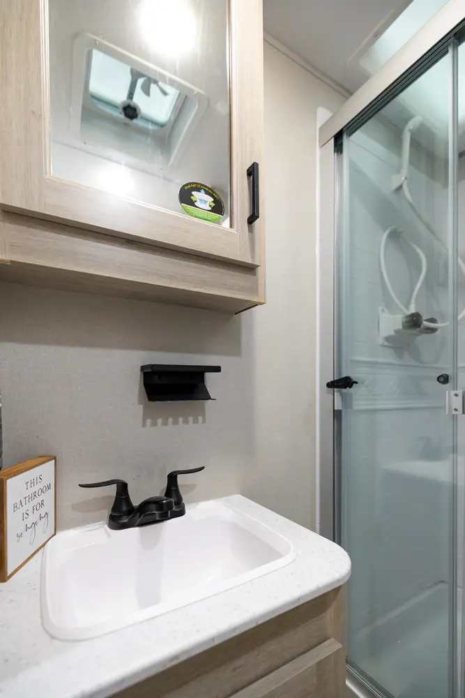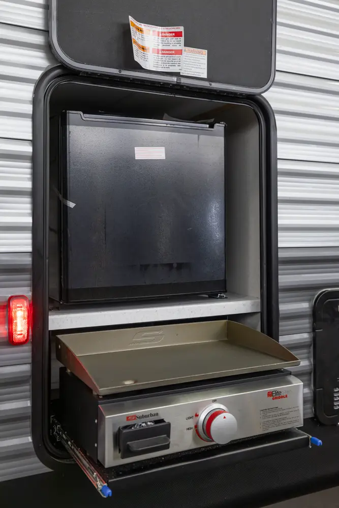 The 303RKDS is your home away from home! The rear kitchen steals the show with expansive counter space and abundant overhead storage. The location of the kitchen allows for a very spacious living room that includes two recliners directly across from the slide-out sofa. The bedroom includes its own entertainment center and fireplace, an enormous closet with full length hang rod and shelves, as well as an additional utility closet complete with everything you need to add a washer/dryer.