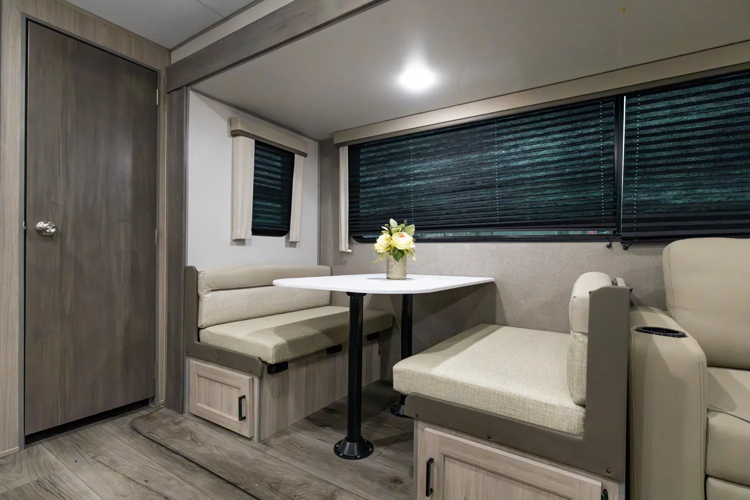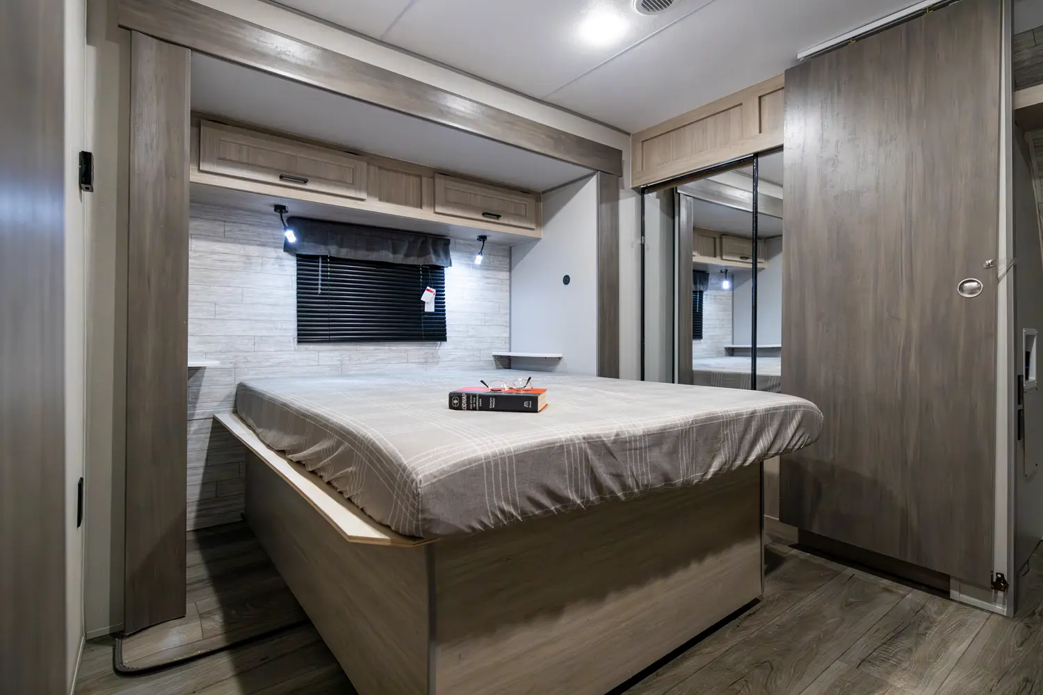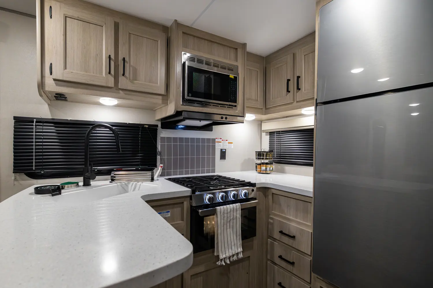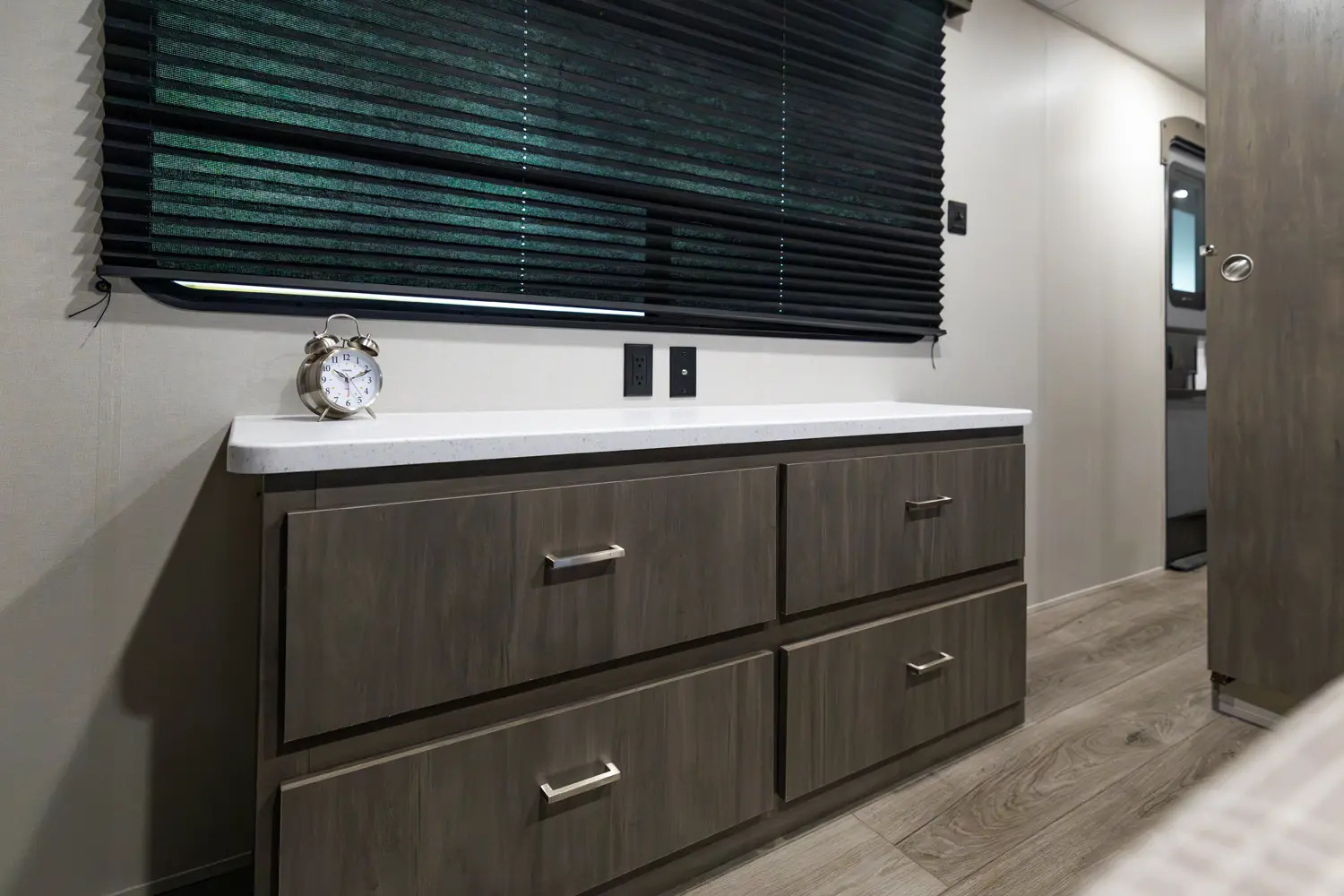 The 303RKDS is your home away from home! The rear kitchen steals the show with expansive counter space and abundant overhead storage. The location of the kitchen allows for a very spacious living room that includes two recliners directly across from the slide-out sofa. The bedroom includes its own entertainment center and fireplace, an enormous closet with full length hang rod and shelves, as well as an additional utility closet complete with everything you need to add a washer/dryer.