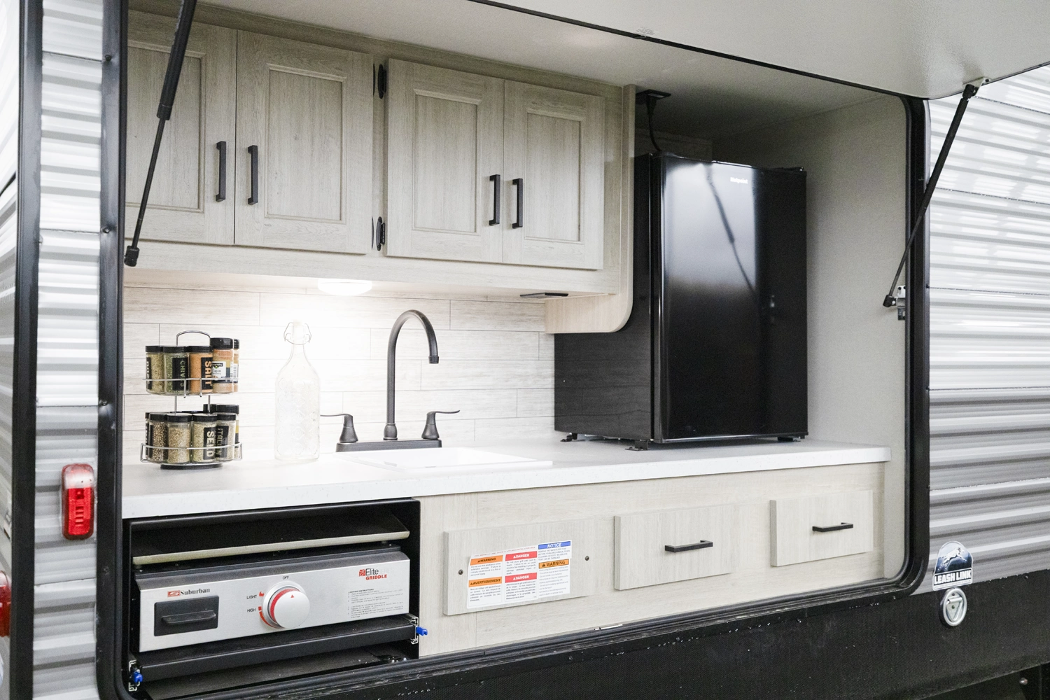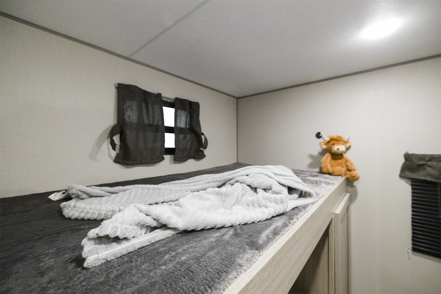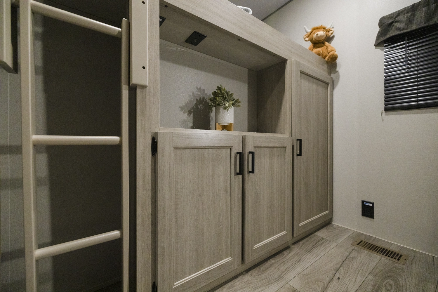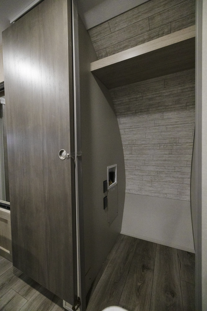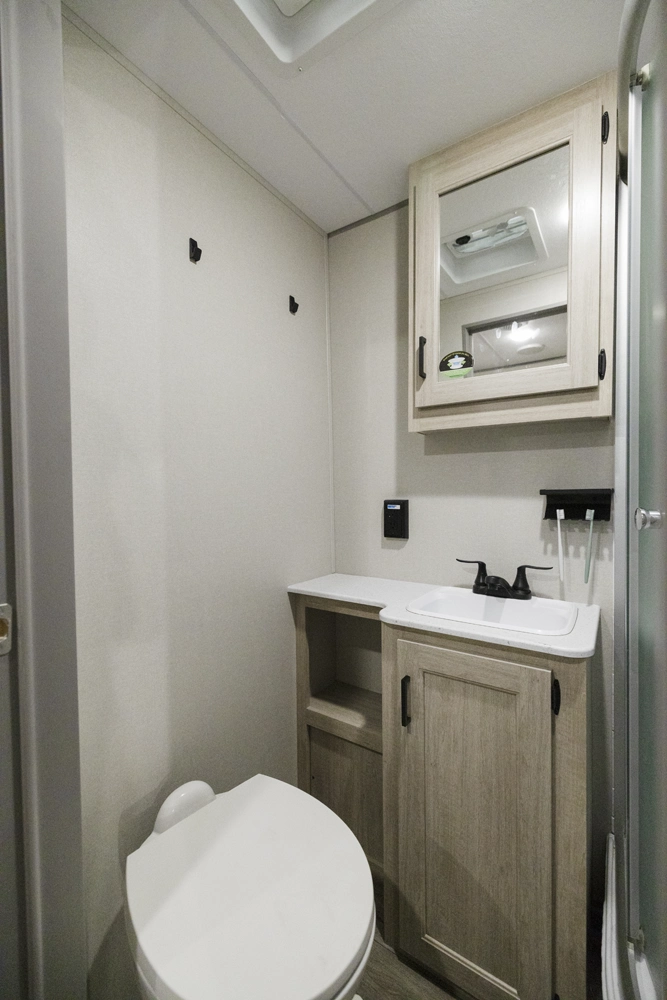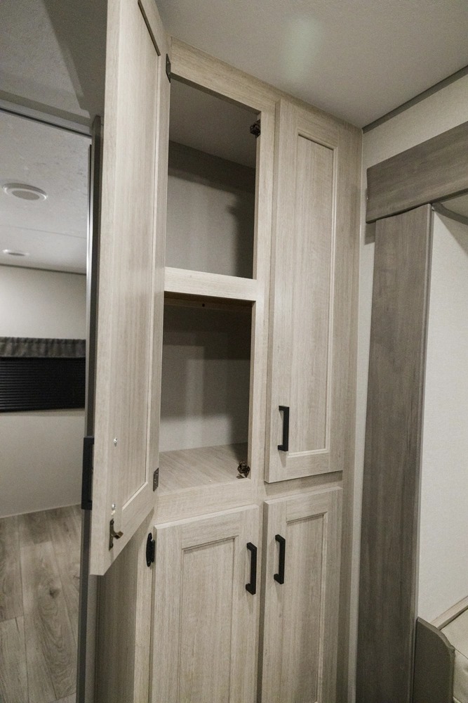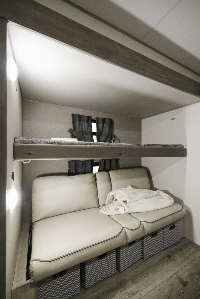The 343BHTS is the premier bunk house floorplan on the market! Our versatile bunk room sleeps 5+ comfortably and includes an ent. center, storage and our unique COA cube futon. We designed the ultimate master suite with an enormous closet with full length hang rod and shelves, as well as an additional utility closet with everything you need to add washer/dryer. On the outside our standard large camp kitchen includes a griddle, dorm style refrigerator, sink, and storage cabinets and drawers.