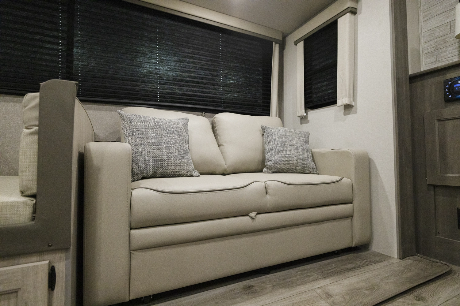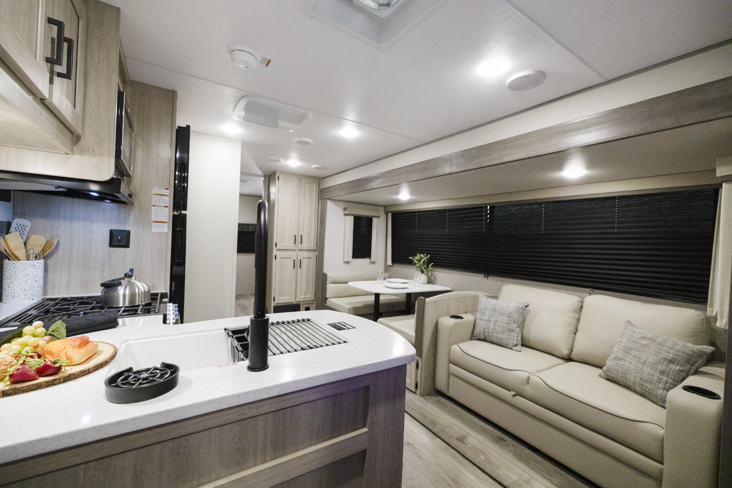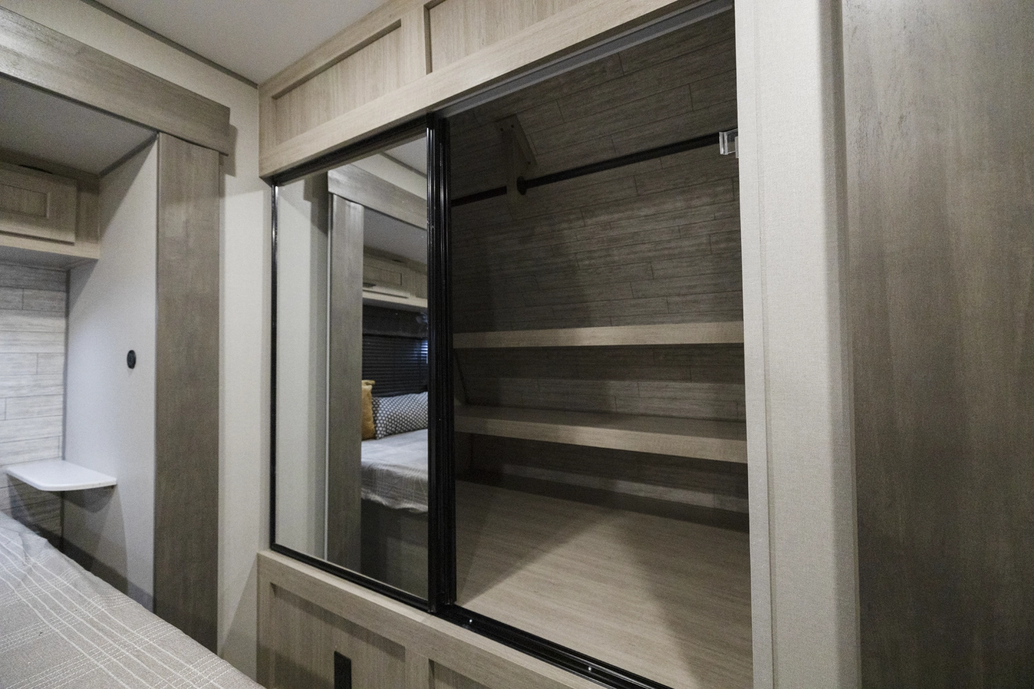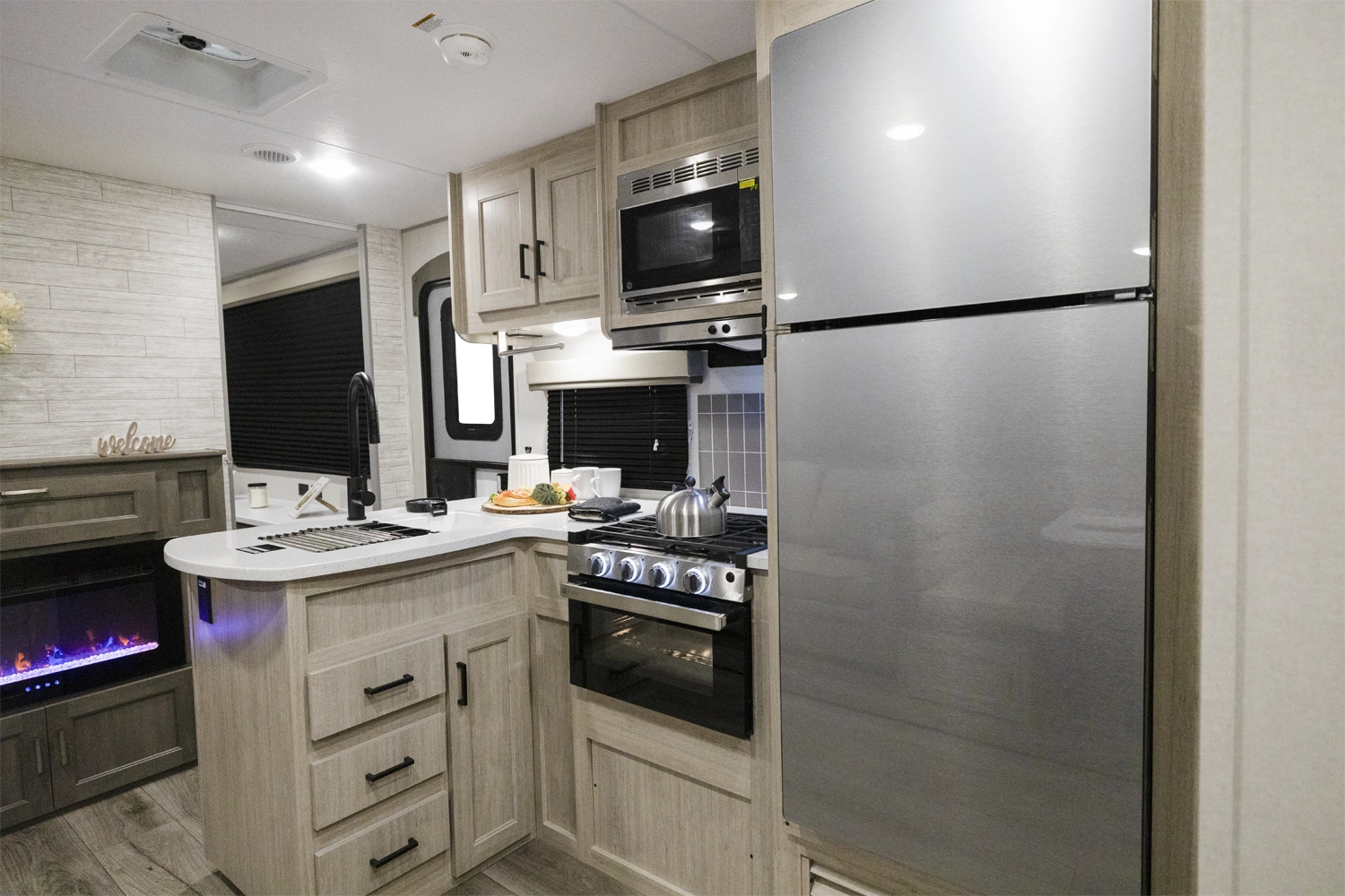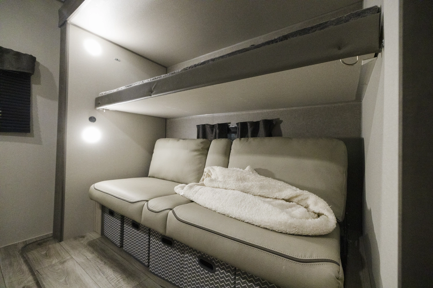 The 343BHTS is the premier bunk house floorplan on the market! Our versatile bunk room sleeps 5+ comfortably and includes an ent. center, storage and our unique COA cube futon. We designed the ultimate master suite with an enormous closet with full length hang rod and shelves, as well as an additional utility closet with everything you need to add washer/dryer. On the outside our standard large camp kitchen includes a griddle, dorm style refrigerator, sink, and storage cabinets and drawers.