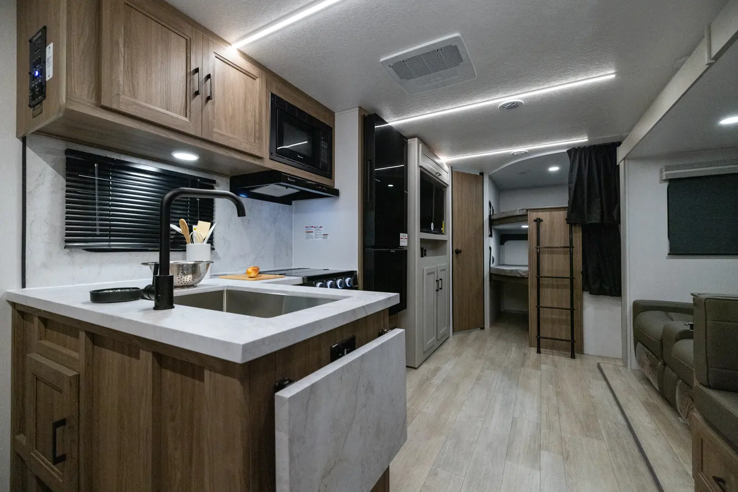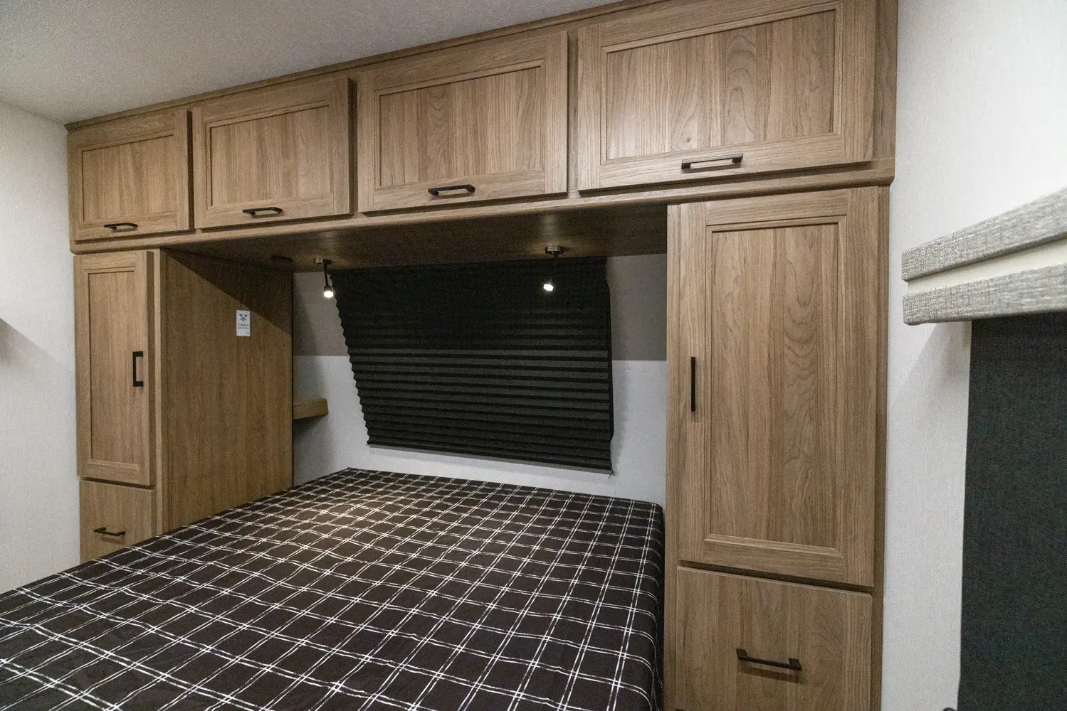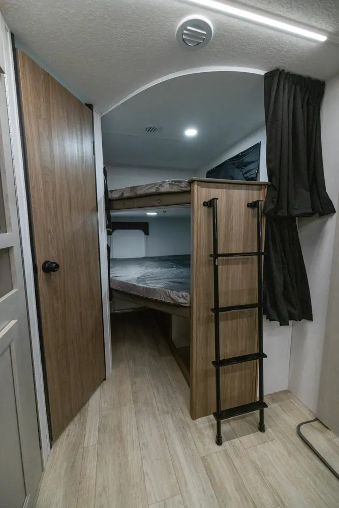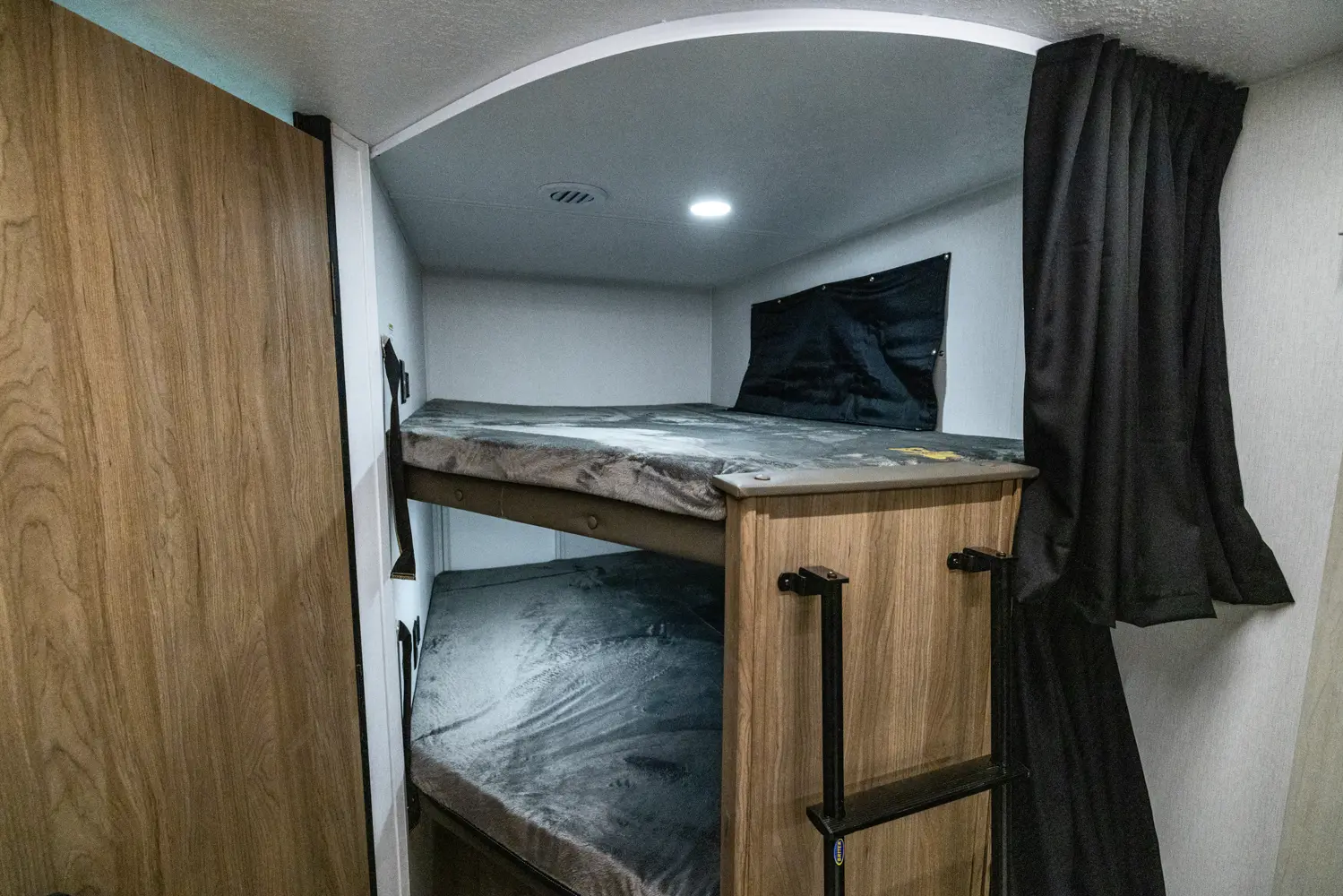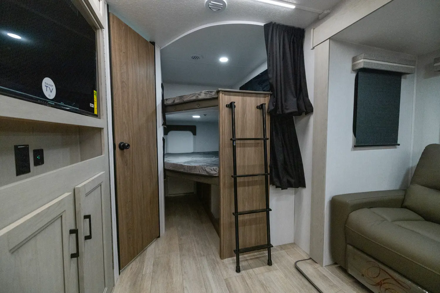 The 288BHDS has one slideout and one entry. Exterior features front pass-thru storage, pull-out camp kitchen, 18 foot awning, and rear storage door. Interior layout front to back: foot-facing queen bed with vaulted underbed storage, overhead cabinet and wardrobes on each side; off-door side slideout with dinette, and optional theater seat/hide-a-bed sofa with overhead cabinet; entry, peninsula kitchen counter with flip-up counter and sink wraps to door side with overhead cabinet, microwave, cooktop, refrigerator, and TV swivel with hidden pantry behind; rear off-door side double over double bunks; rear door side full bathroom with entry.