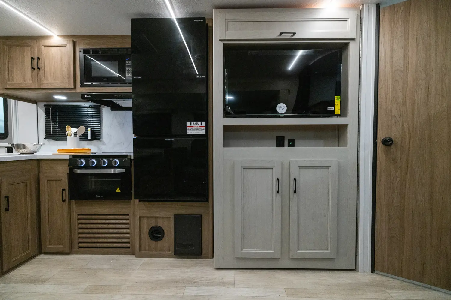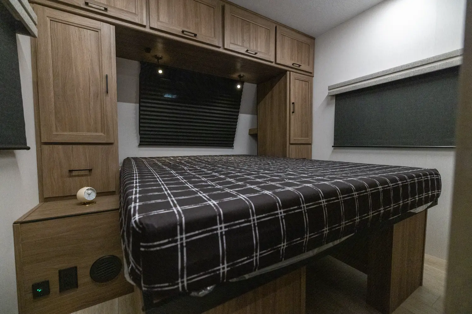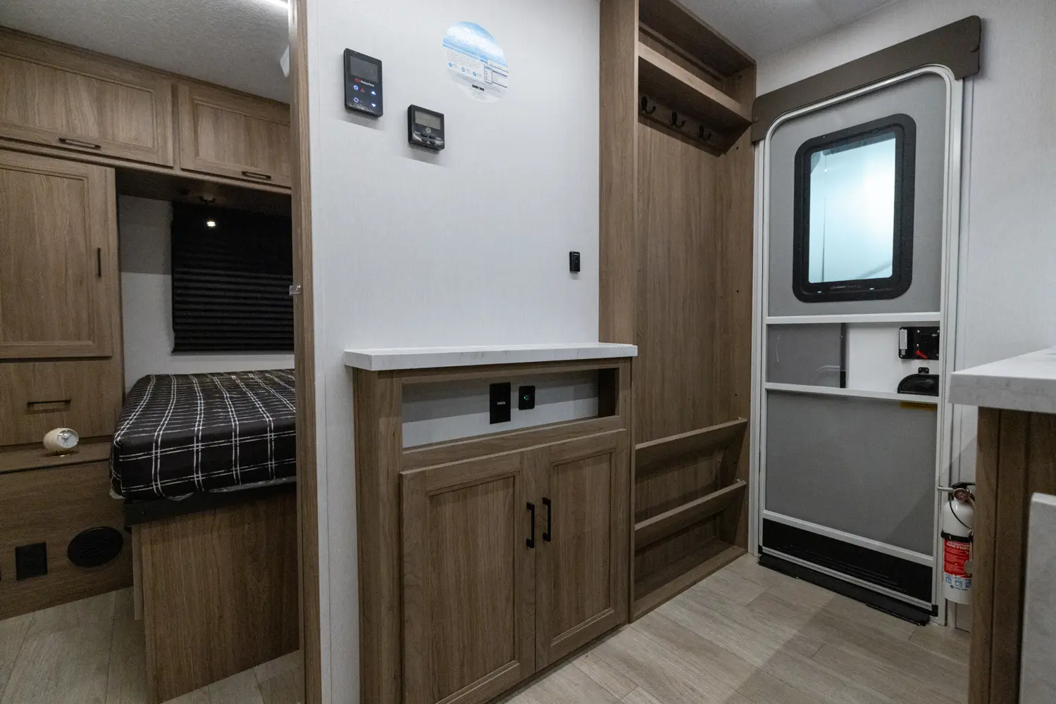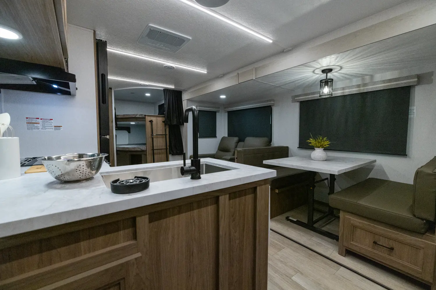 The 288BHDS has one slideout and one entry. Exterior features front pass-thru storage, pull-out camp kitchen, 18 foot awning, and rear storage door. Interior layout front to back: foot-facing queen bed with vaulted underbed storage, overhead cabinet and wardrobes on each side; off-door side slideout with dinette, and optional theater seat/hide-a-bed sofa with overhead cabinet; entry, peninsula kitchen counter with flip-up counter and sink wraps to door side with overhead cabinet, microwave, cooktop, refrigerator, and TV swivel with hidden pantry behind; rear off-door side double over double bunks; rear door side full bathroom with entry.