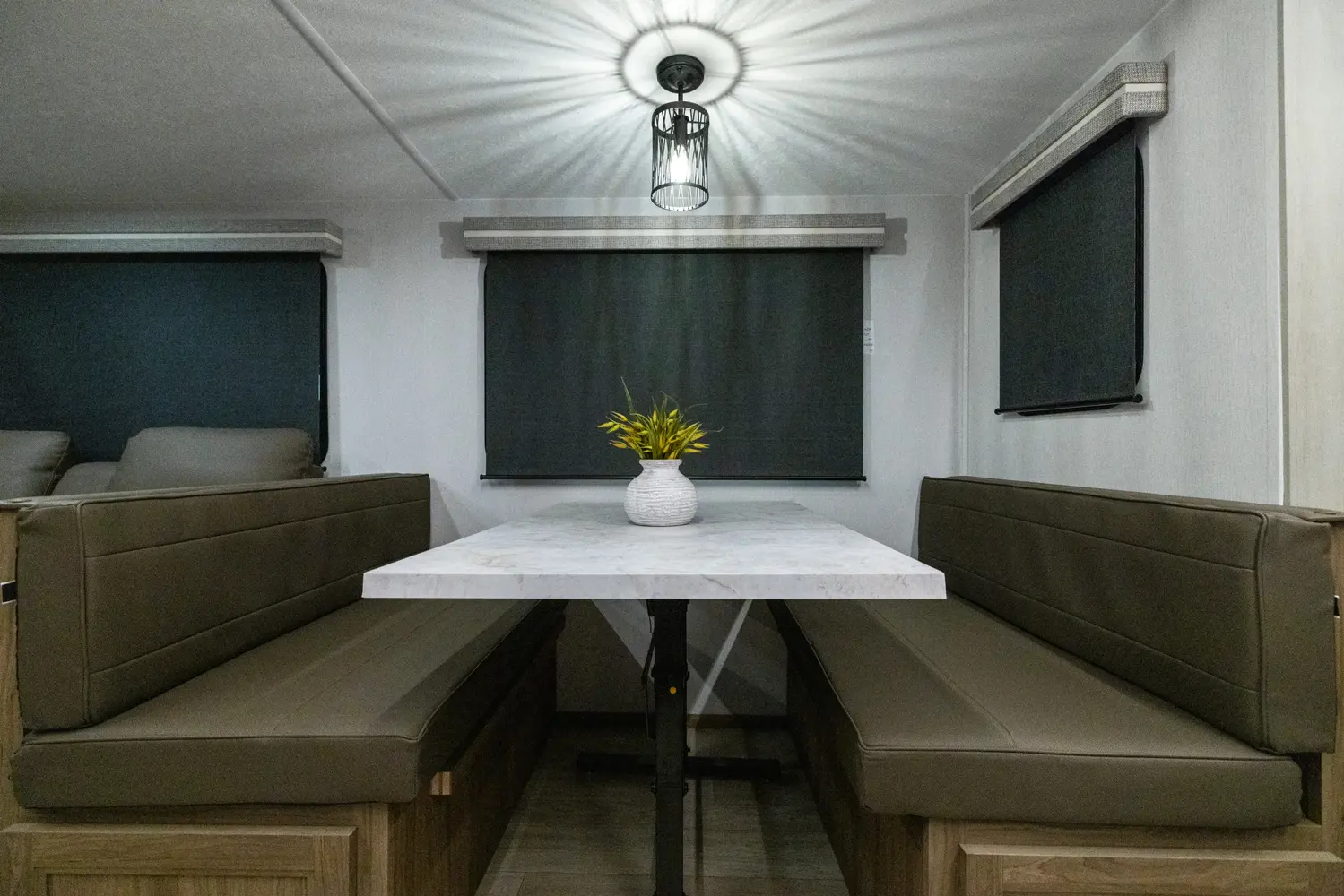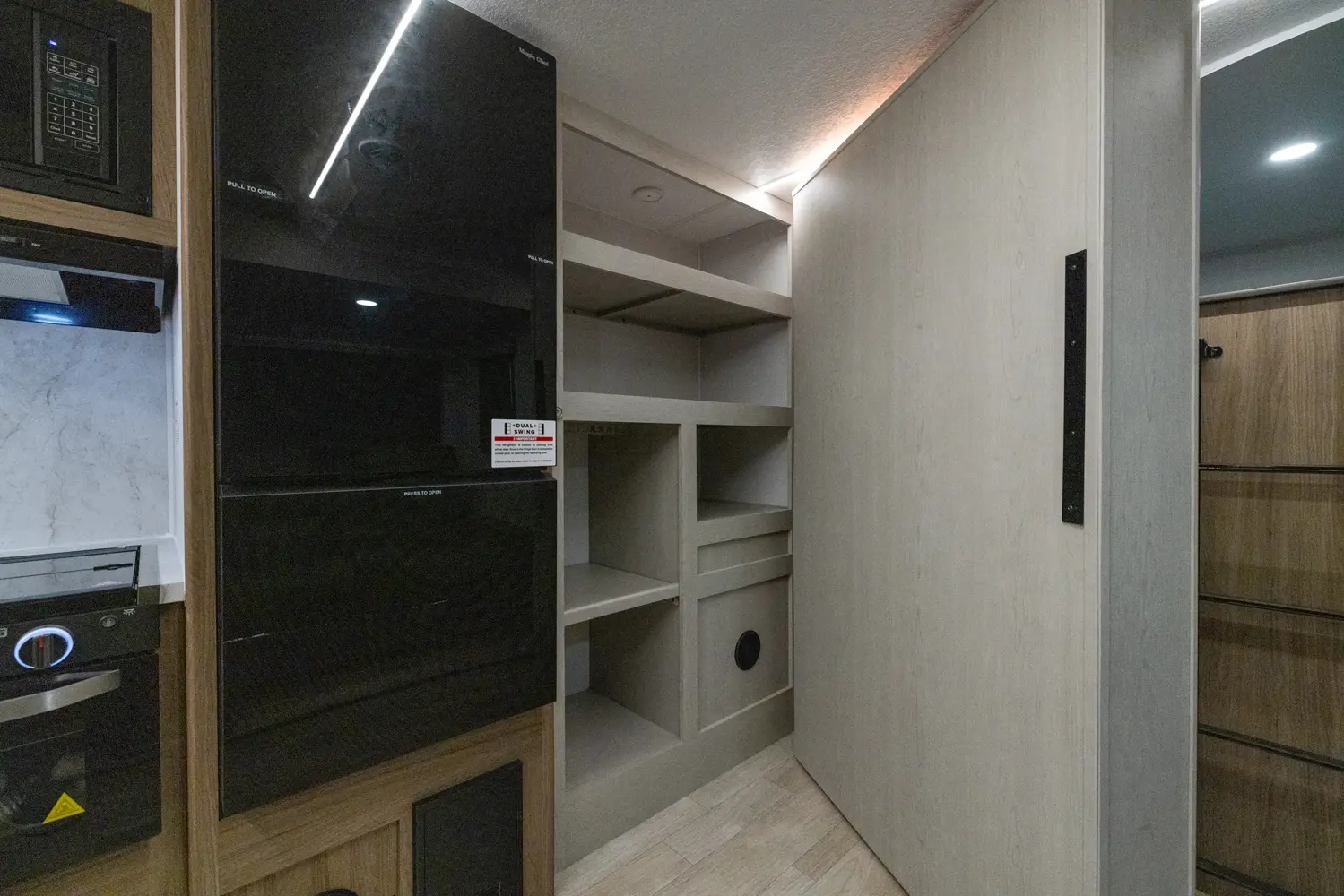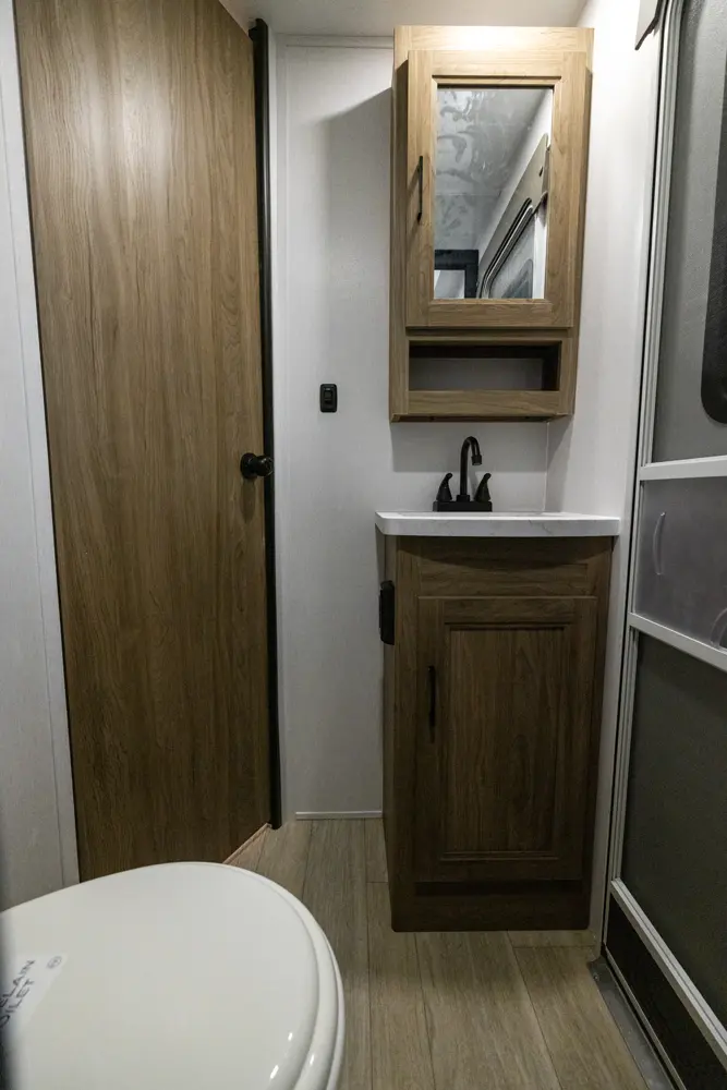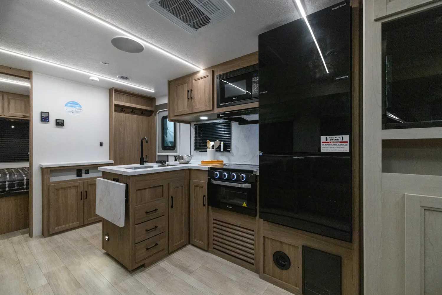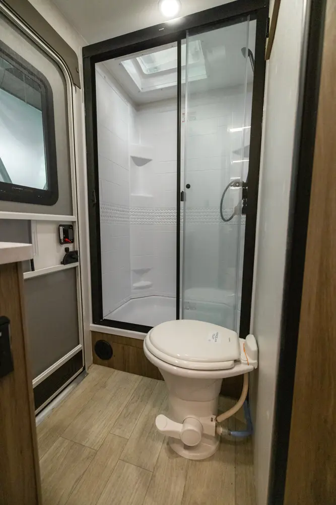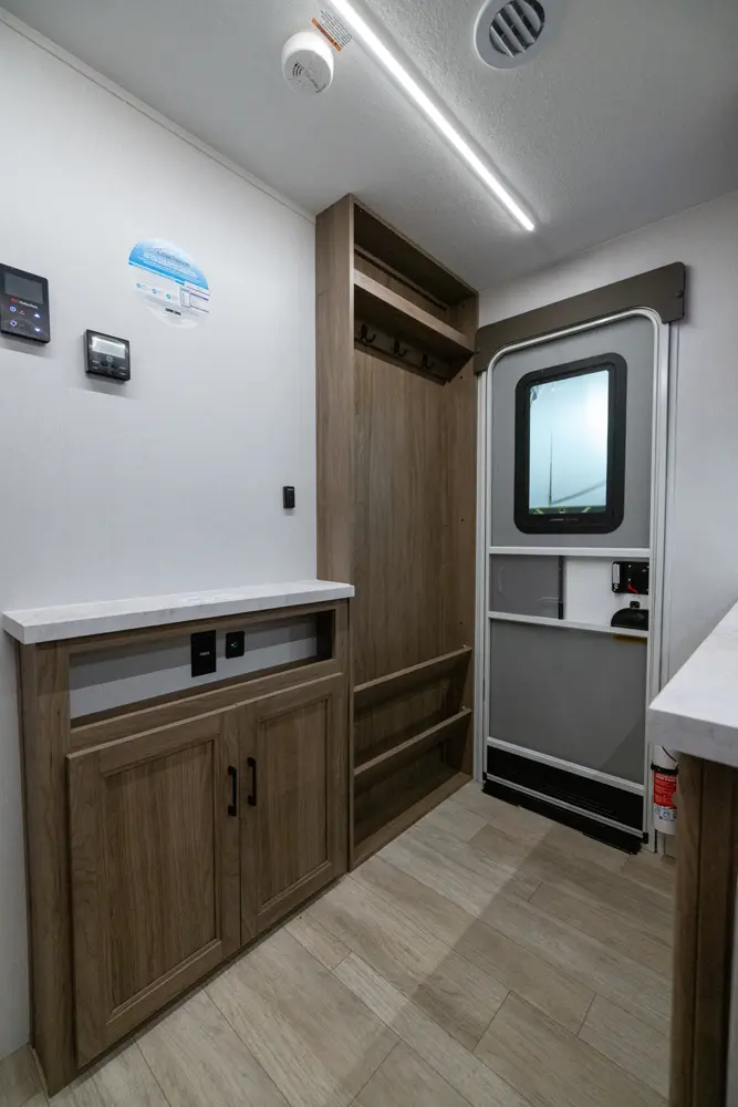 The 288BHDS has one slideout and one entry. Exterior features front pass-thru storage, pull-out camp kitchen, 18 foot awning, and rear storage door. Interior layout front to back: foot-facing queen bed with vaulted underbed storage, overhead cabinet and wardrobes on each side; off-door side slideout with dinette, and optional theater seat/hide-a-bed sofa with overhead cabinet; entry, peninsula kitchen counter with flip-up counter and sink wraps to door side with overhead cabinet, microwave, cooktop, refrigerator, and TV swivel with hidden pantry behind; rear off-door side double over double bunks; rear door side full bathroom with entry.