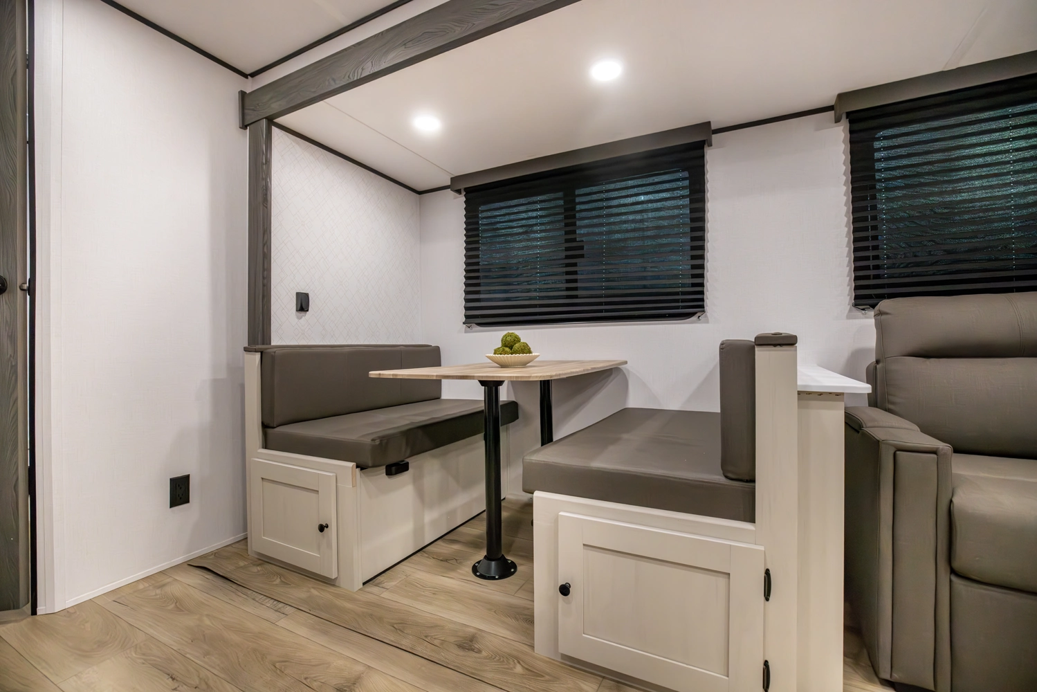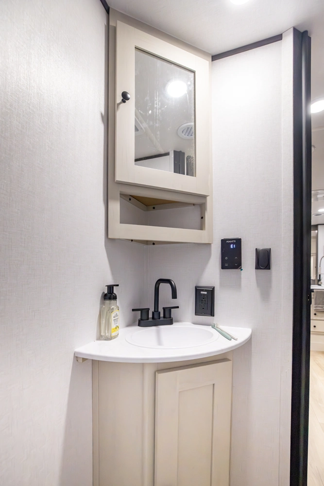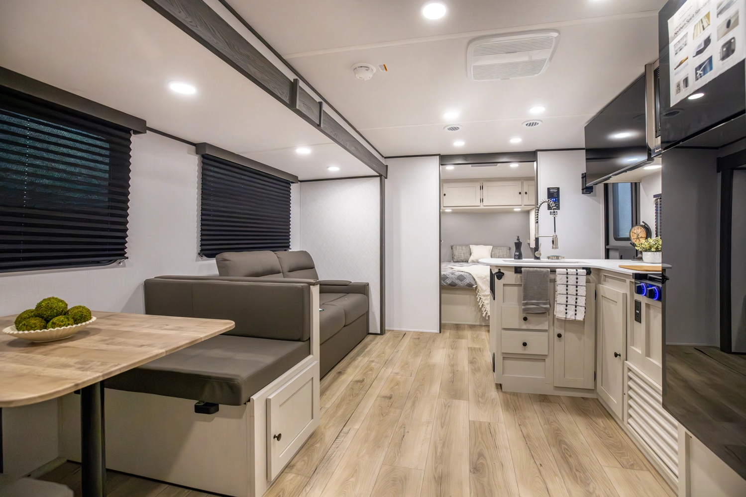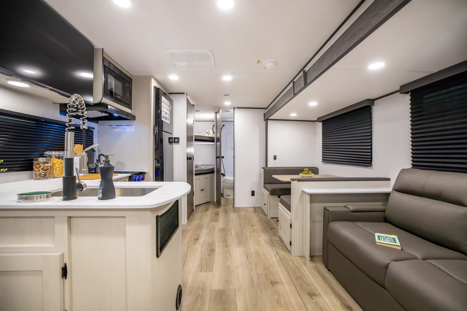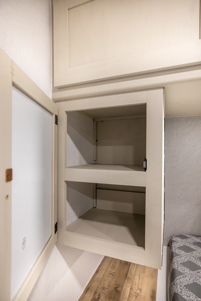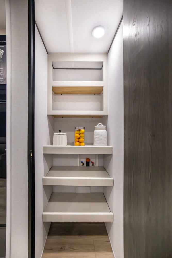 This family-friendly coach features a double-over-double bunk design with inside and outside storage under the bottom bunk. A super slide opens the living area to a booth dinette and a sofa with theater seating options, and a large pantry with washer/dryer prep keeps everything neatly stored, creating a comfortable and functional space for the whole family.