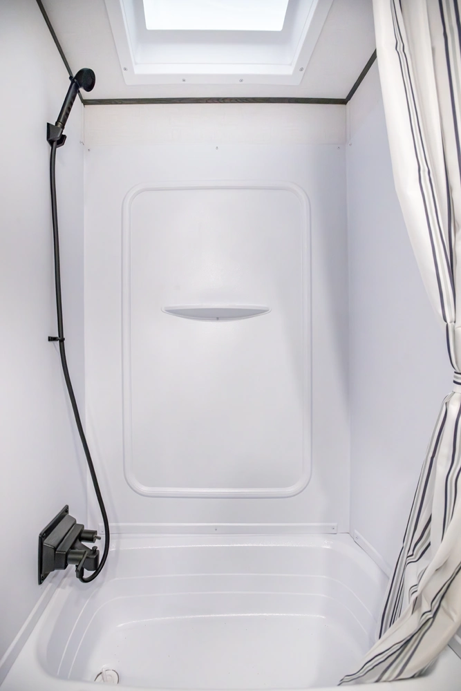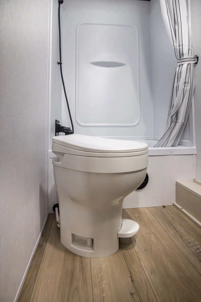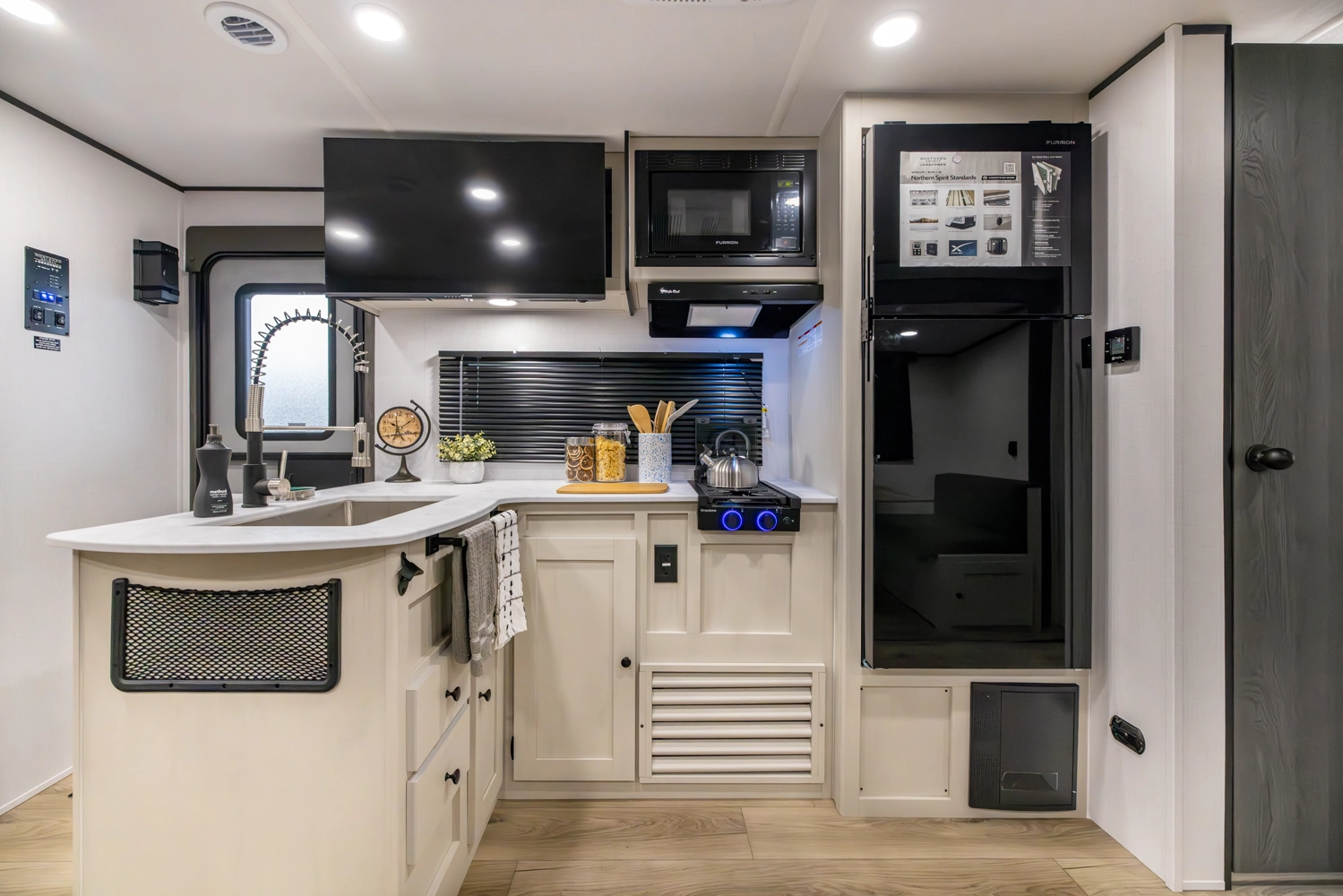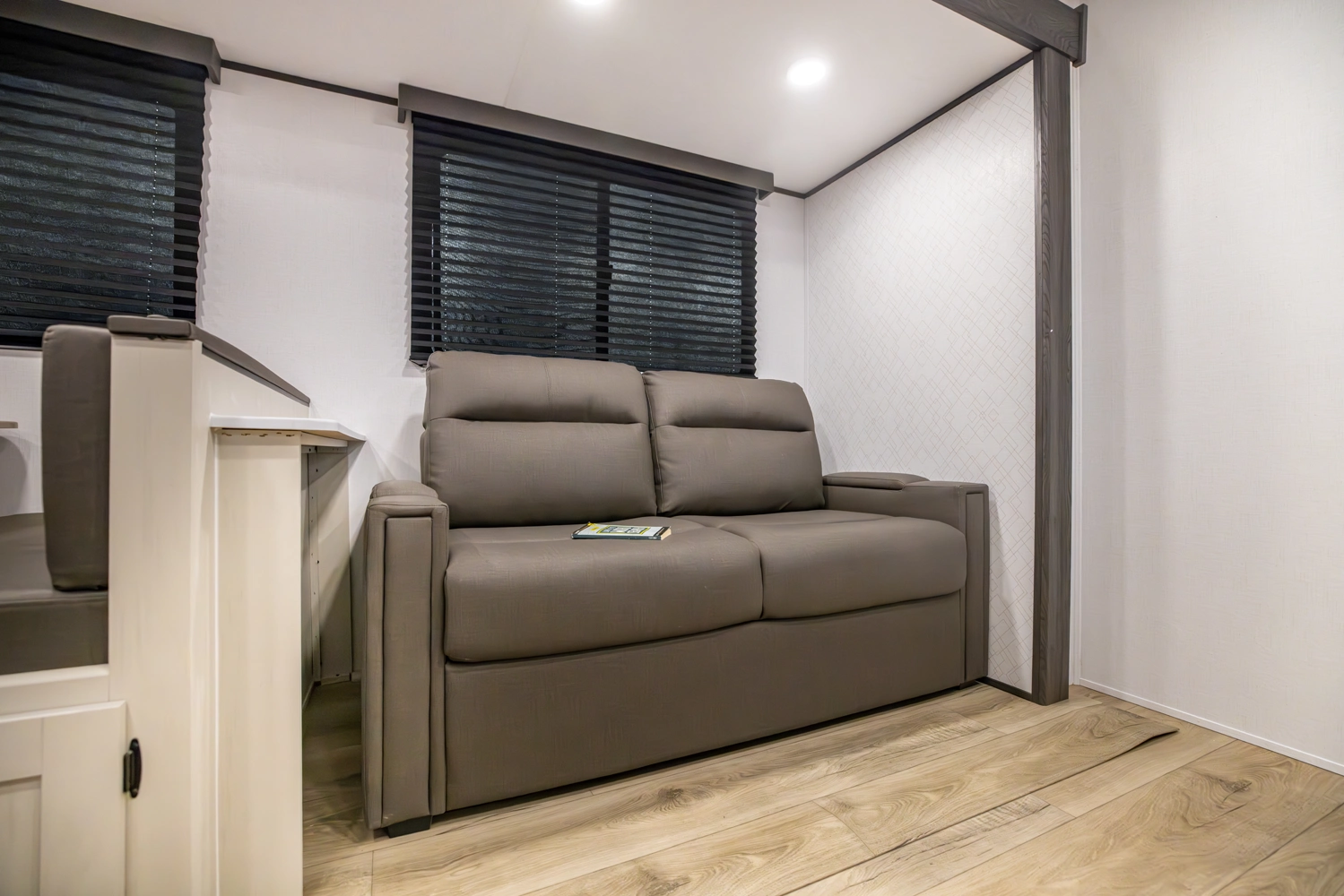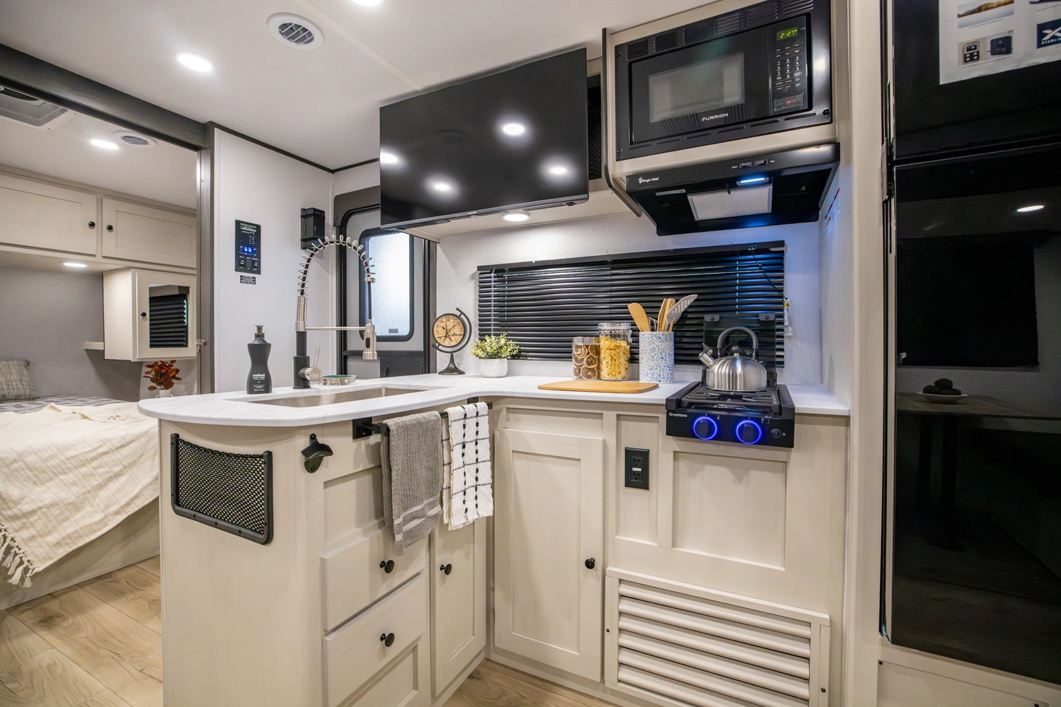 This family-friendly coach features a double-over-double bunk design with inside and outside storage under the bottom bunk. A super slide opens the living area to a booth dinette and a sofa with theater seating options, and a large pantry with washer/dryer prep keeps everything neatly stored, creating a comfortable and functional space for the whole family.