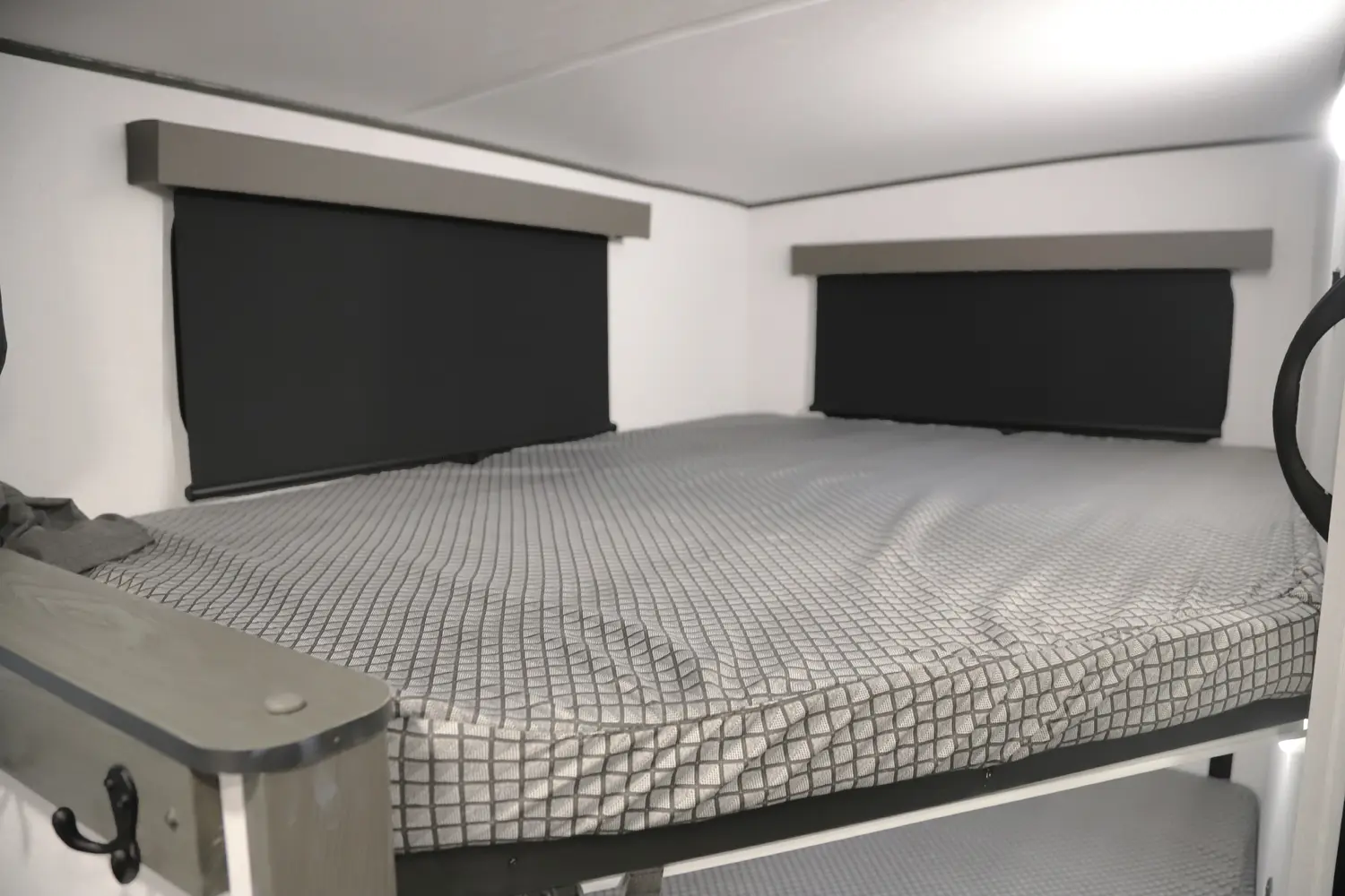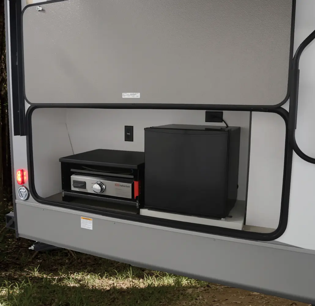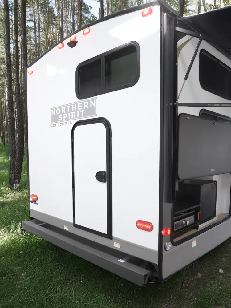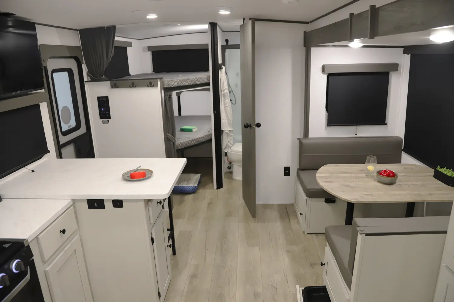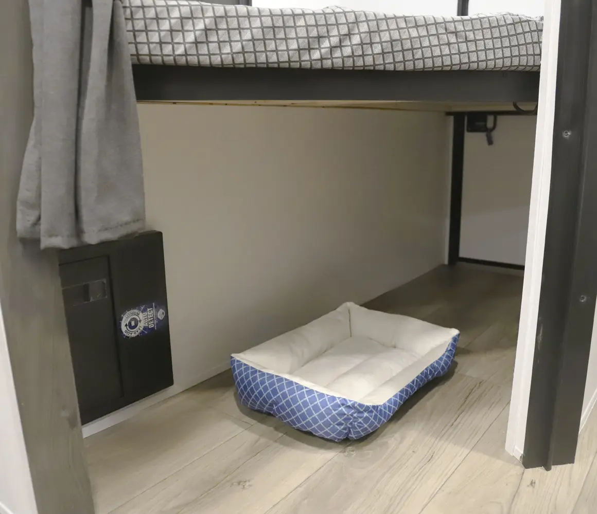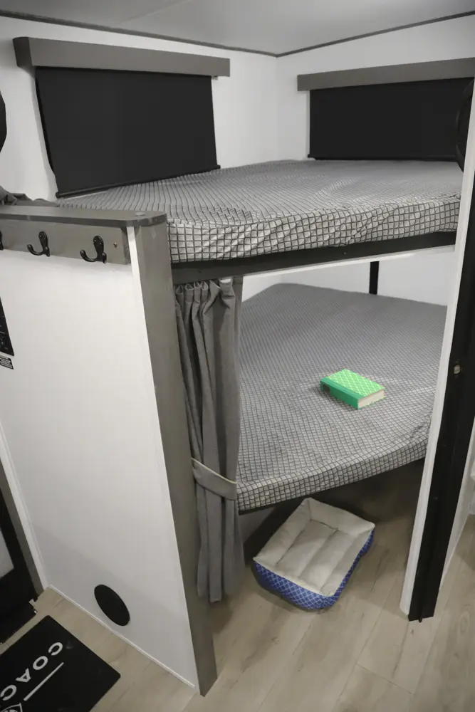 At 29 ft, this travel trailer offers double-over-double rear bunks with a Store-More cargo center under the bottom bunk for easy loading. A dinette slideout opens up the living area, and the bartop with chairs provides a practical space for meals or extra prep. Up front, a private bedroom offers a quiet retreat, making the 2457 a convenient and family-friendly choice for your next trip.