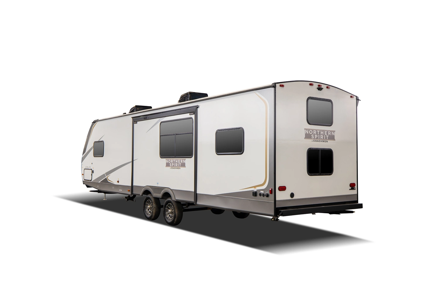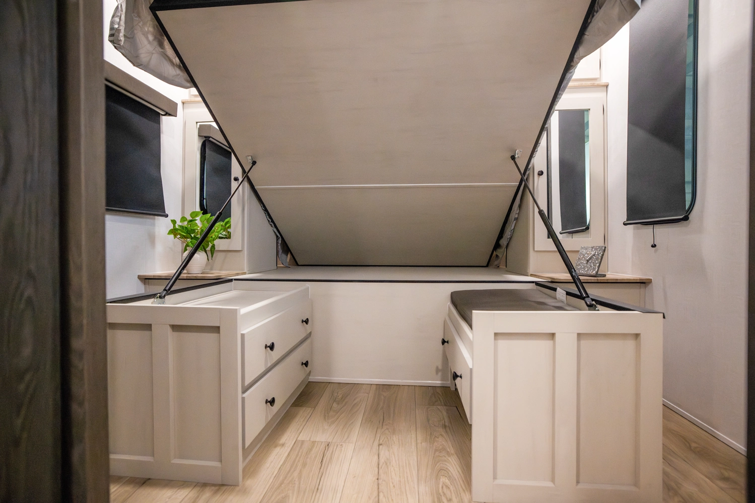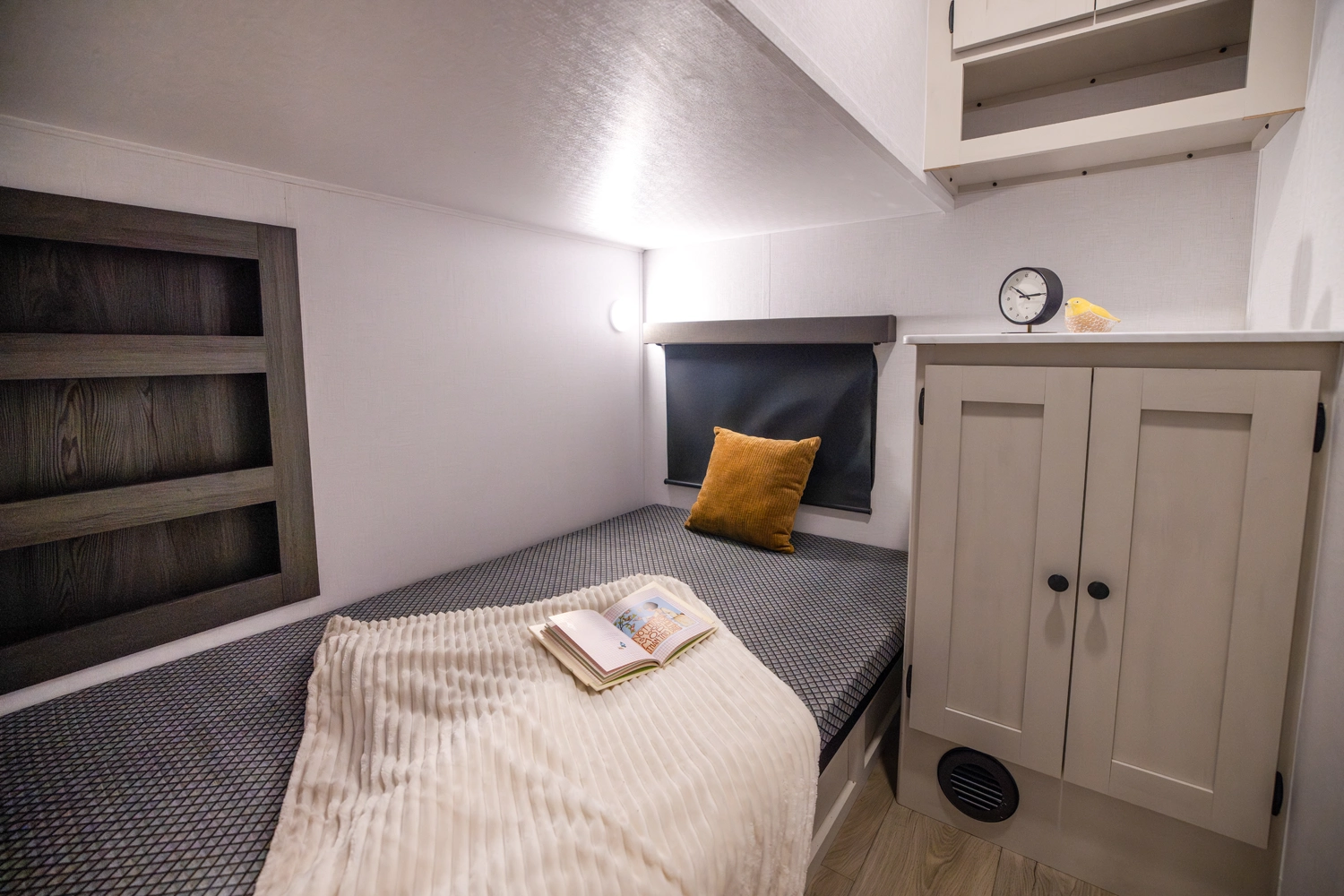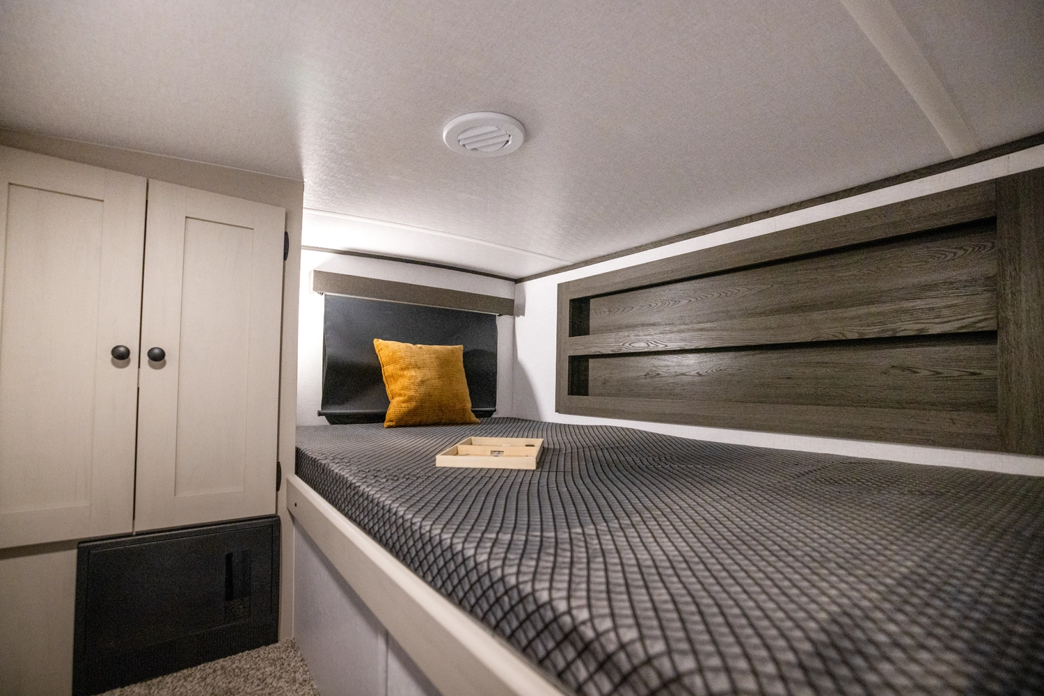 A great family trailer featuring two private bunk rooms with ample built-in storage. The spacious living area includes a dinette positioned beside a large window overlooking your campsite. It also offers a roomy bathroom with washer/dryer prep and a second entrance that leads directly into the bedroom for added convenience.