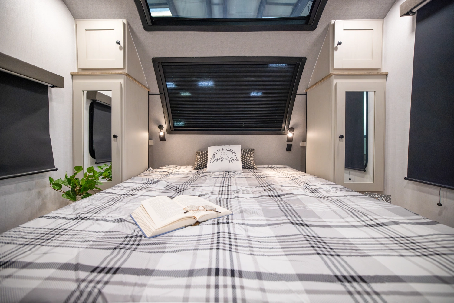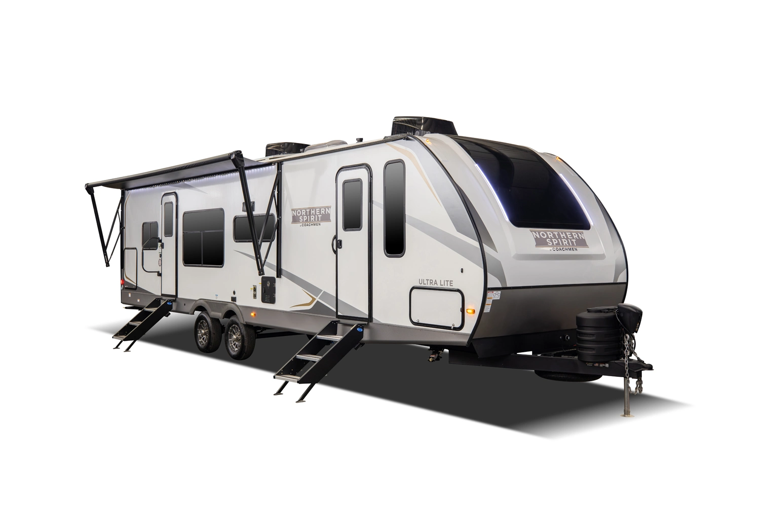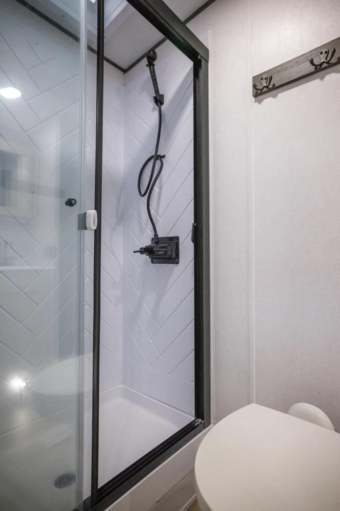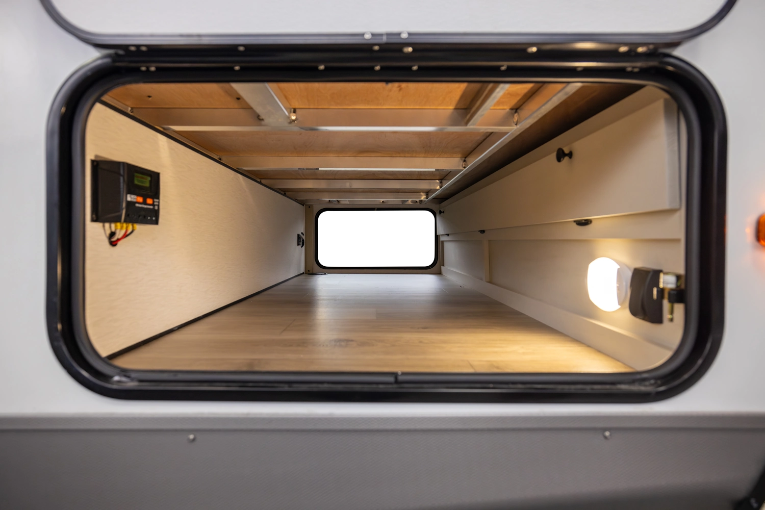 A great family trailer featuring two private bunk rooms with ample built-in storage. The spacious living area includes a dinette positioned beside a large window overlooking your campsite. It also offers a roomy bathroom with washer/dryer prep and a second entrance that leads directly into the bedroom for added convenience.