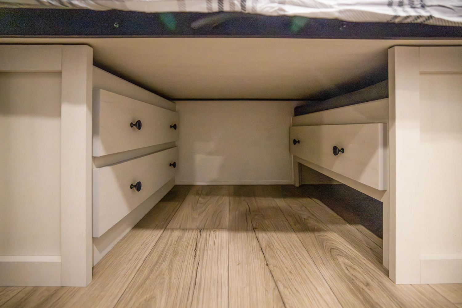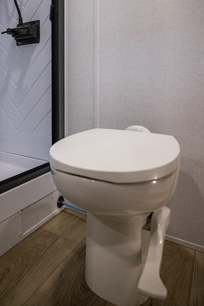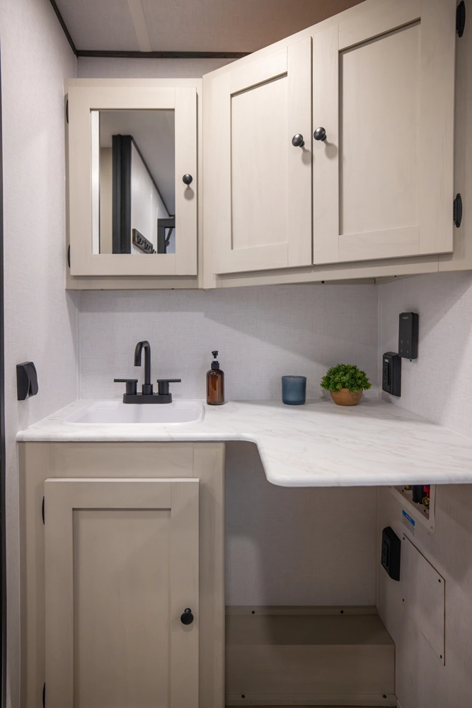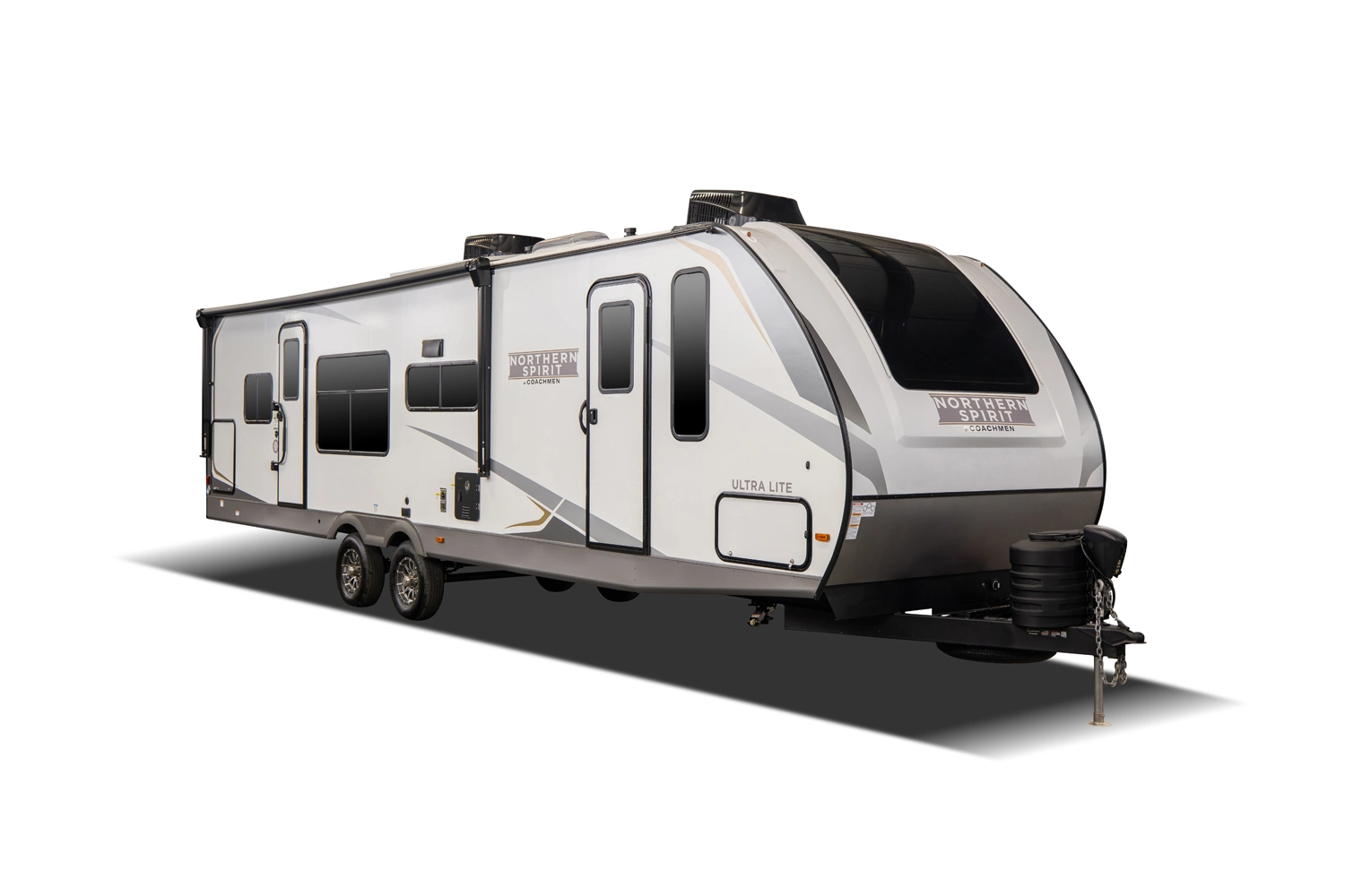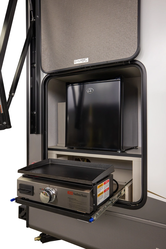 A great family trailer featuring two private bunk rooms with ample built-in storage. The spacious living area includes a dinette positioned beside a large window overlooking your campsite. It also offers a roomy bathroom with washer/dryer prep and a second entrance that leads directly into the bedroom for added convenience.